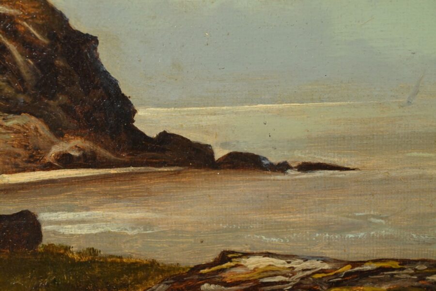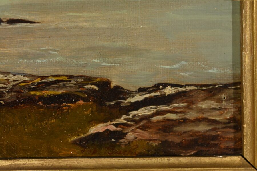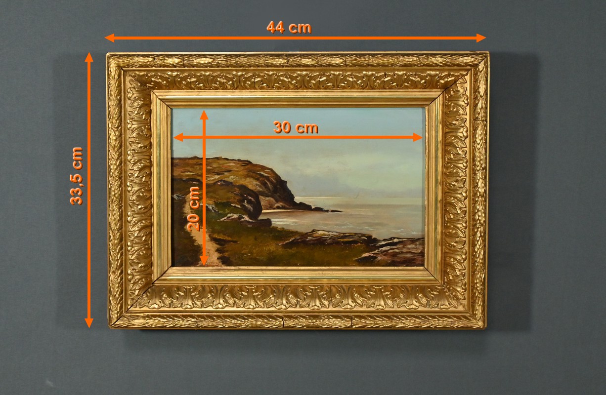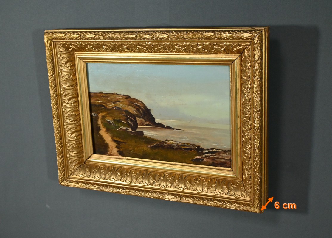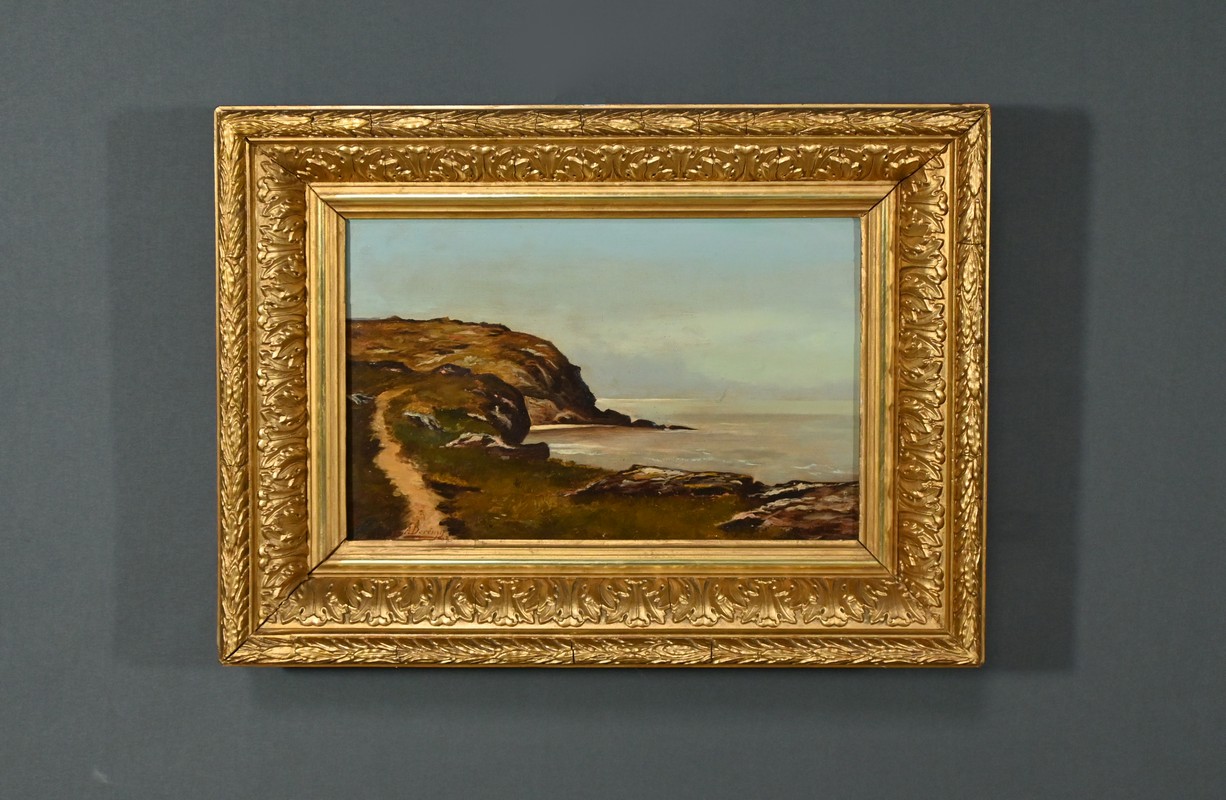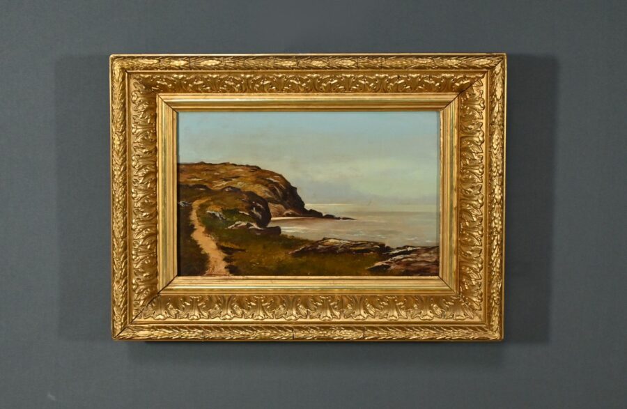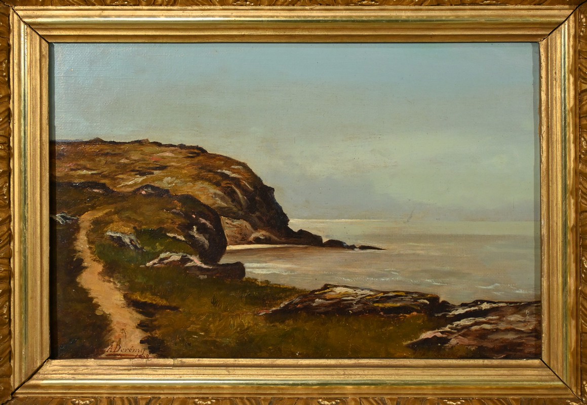 Cette peinture à l’huile signée A. Derémy (XIX-XX) et datant de 1902 est une œuvre finement travaillée représentant un paysage côtier pittoresque avec un sentier douanier courant le long d’une falaise.