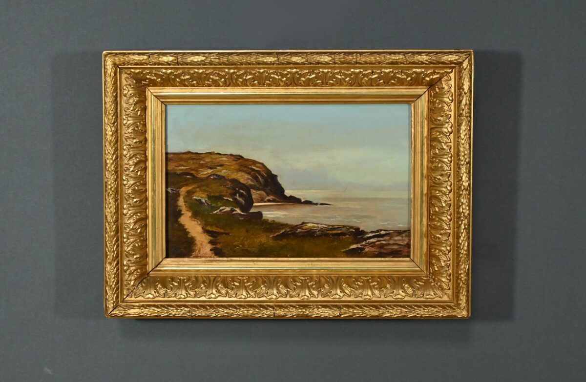 Cette peinture à l’huile signée A. Derémy (XIX-XX) et datant de 1902 est une œuvre finement travaillée représentant un paysage côtier pittoresque avec un sentier douanier courant le long d’une falaise.
