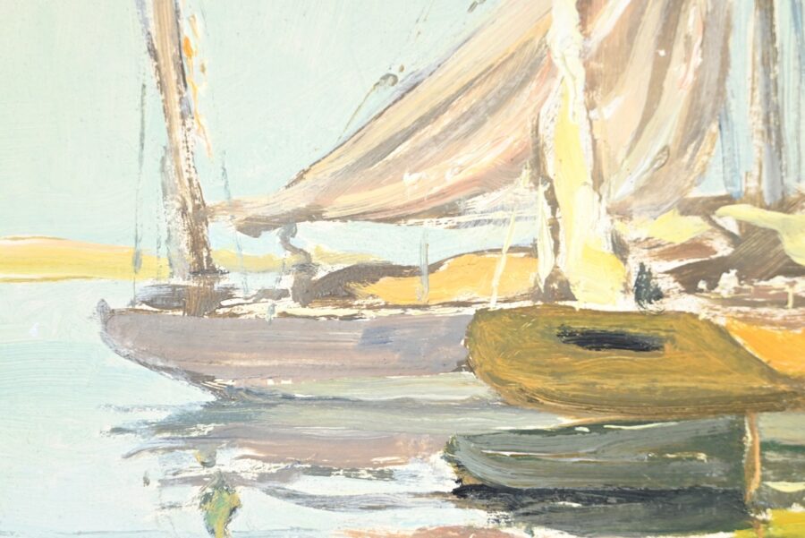 « Chalutier et Thoniers » représente une scène de pêche. En pleins préparatifs pour le départ en mer, les pécheurs gagnent leurs bateaux à l’aide de petites embarcations.
