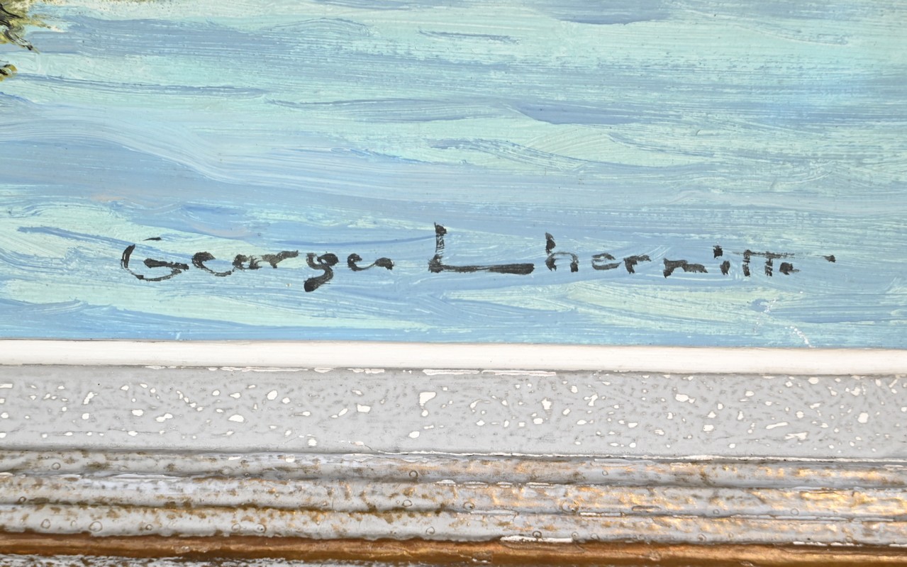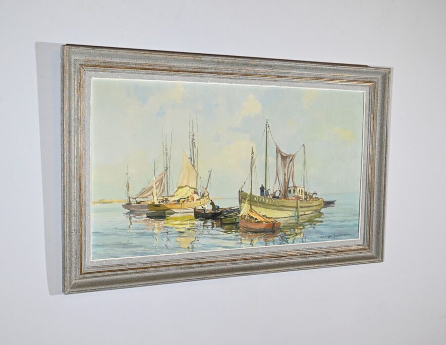 Peinture à l’huile sur Isorel, titrée au dos « Chalutier et Thoniers », signée Georges Lhermitte (1882-1967).