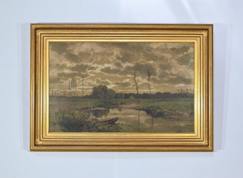 Ce panneau d’isorel peint est souligné par un cadre de couleur blanc antique avec filet doré.