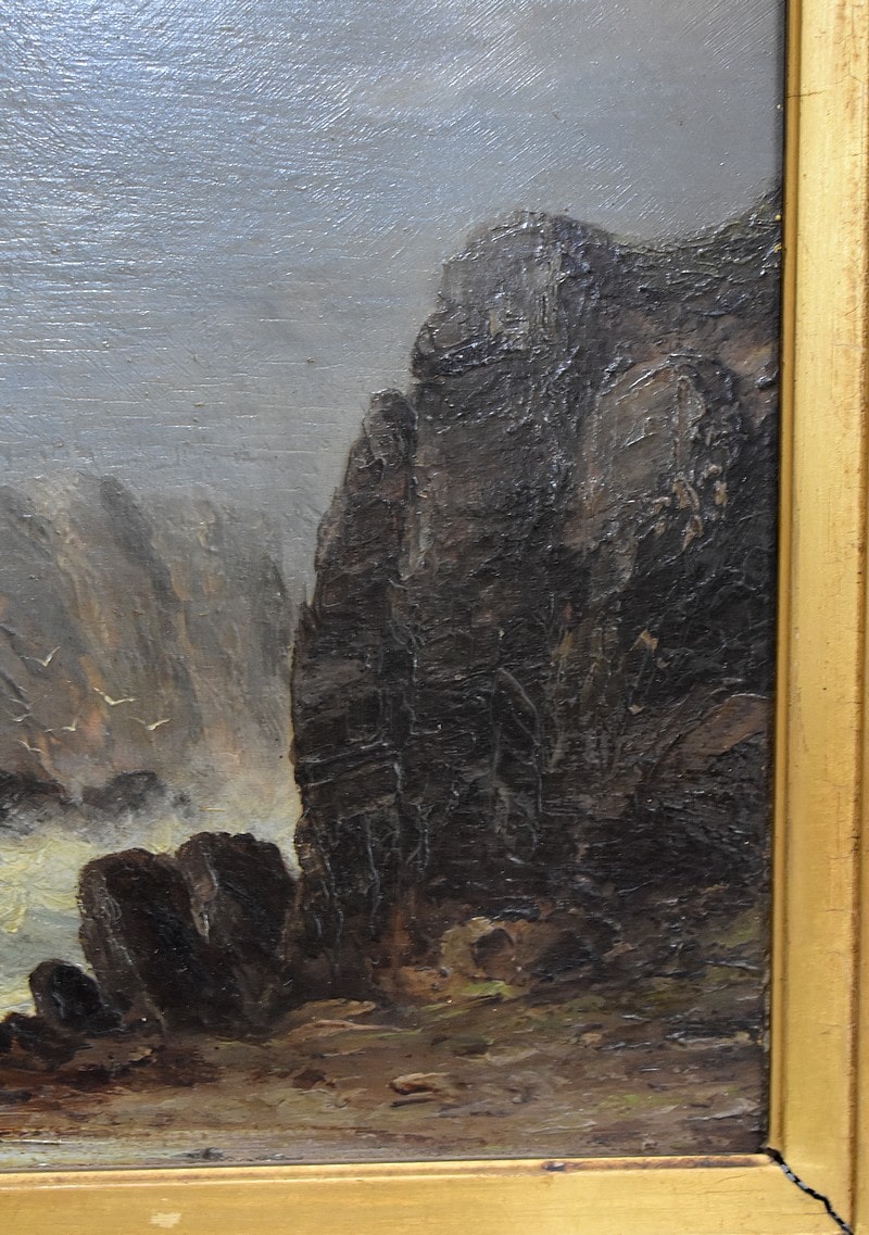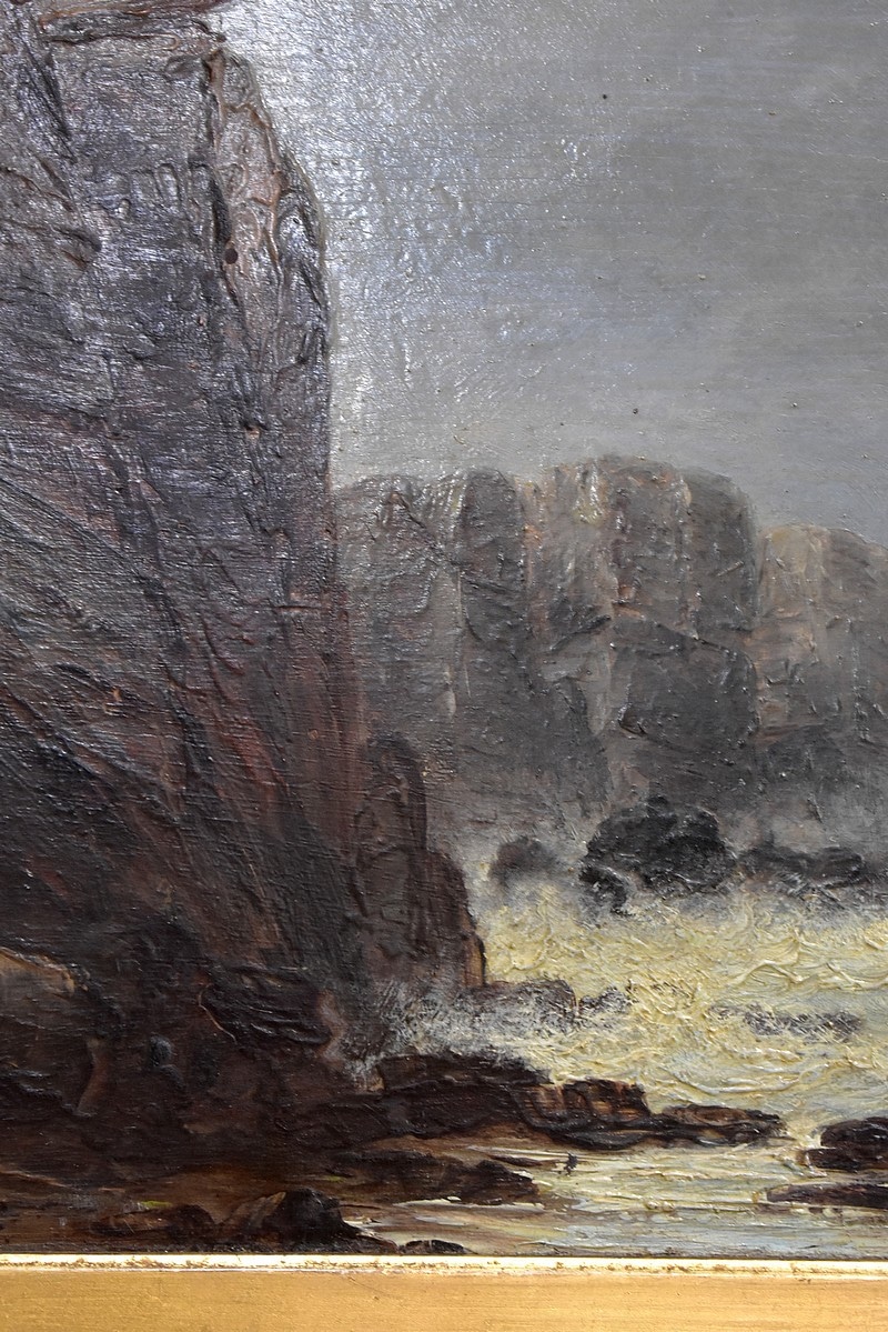 Comme indiqué au dos du tableau, il représente la côte sauvage de Belle-île par mauvais temps.