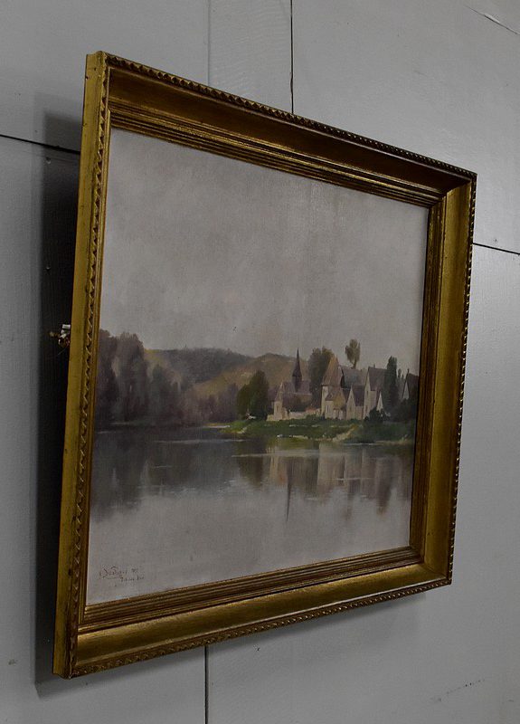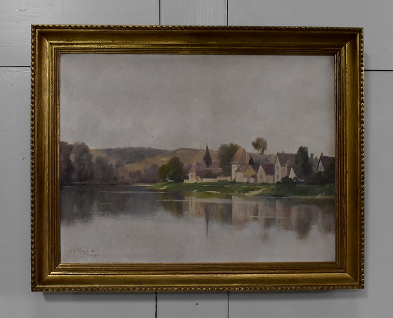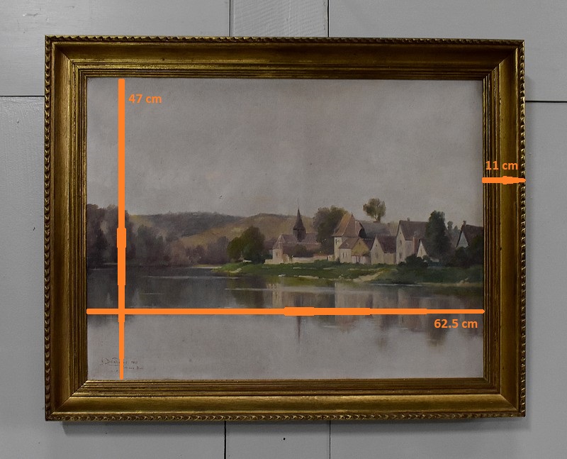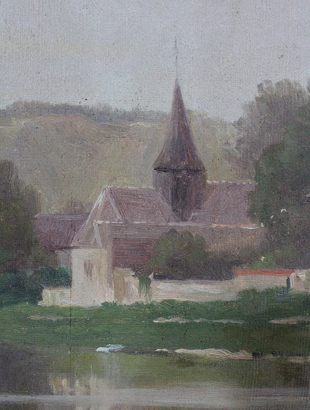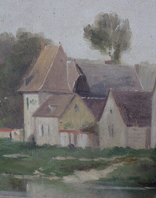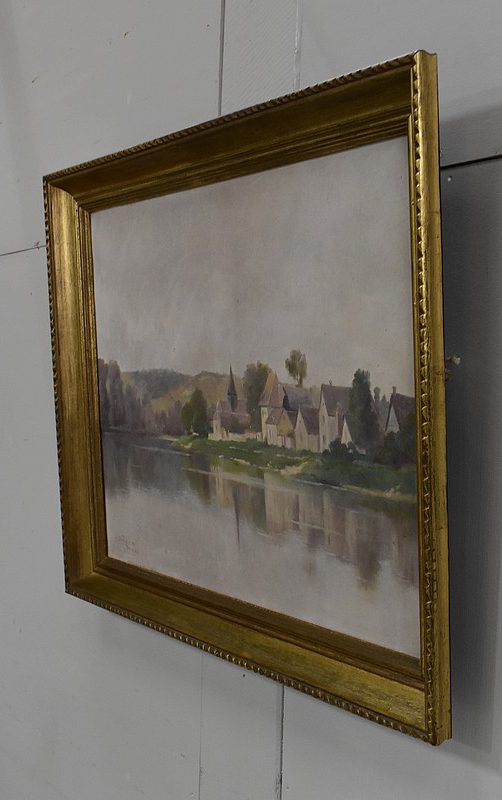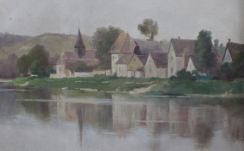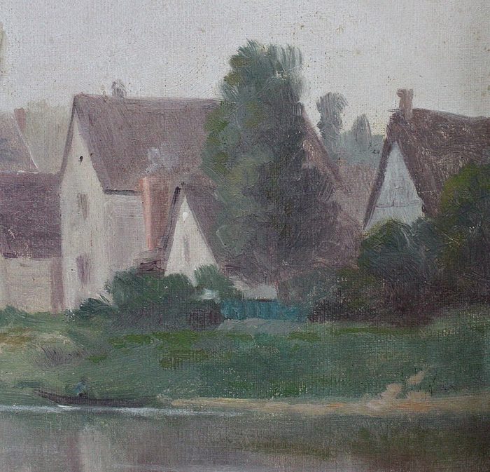 On aperçoit l’un d’eux, au centre de la Toile, aux côtés de petites maisons aux hauteurs de toits variées. Le hameau s’inscrit dans un environnement verdoyant, vallonné en arrière plan, et arboré à gauche. Ce Paysage, situé en bord de Seine, se reflète dans l’eau du fleuve.