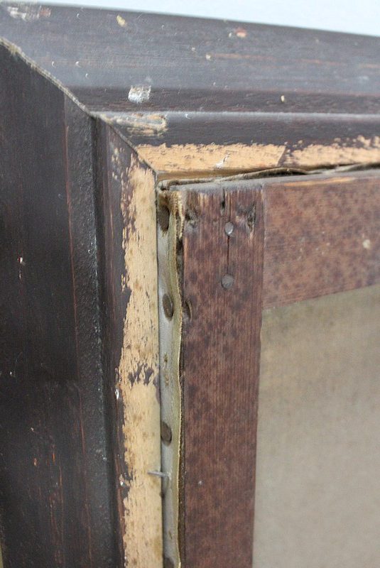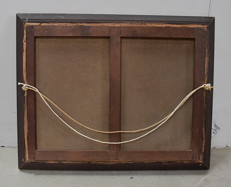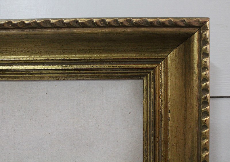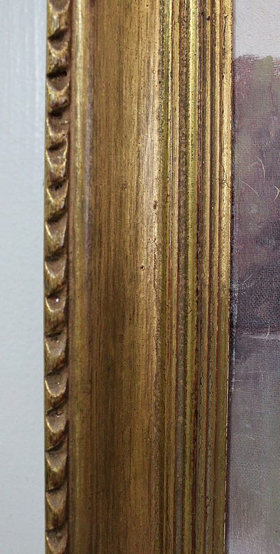 Cette Peinture est enchâssée dans un Cadre Doré, Mouluré sur l’intérieur, et Festonné sur le pourtour extérieur.