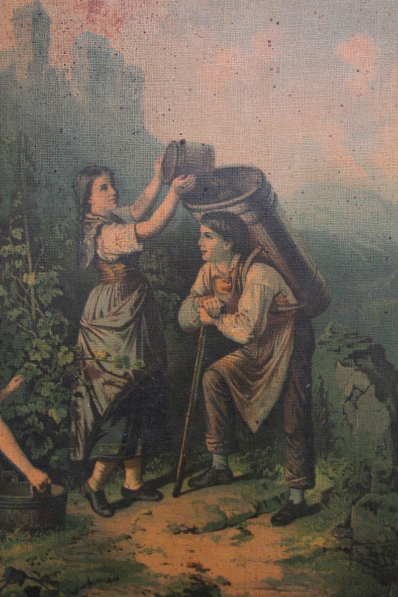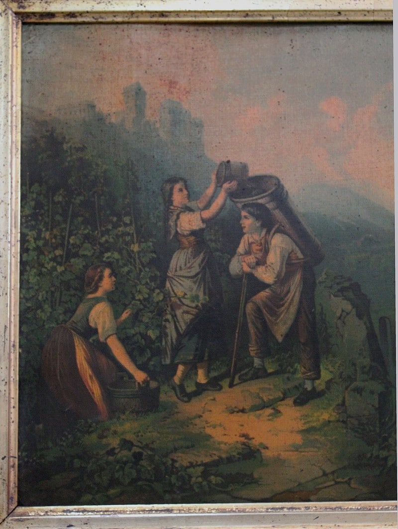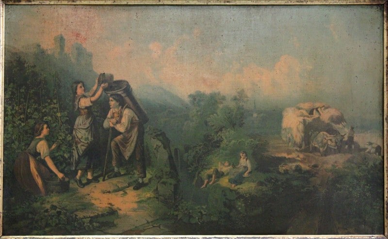 Il représente une scène de vendanges et de moisson où 2 jeunes femmes et un jeune homme s’occupent de la récolte du raisin sur la partie gauche du tableau tandis que sur la partie droite, 2 hommes et une femme ramassent le foin.