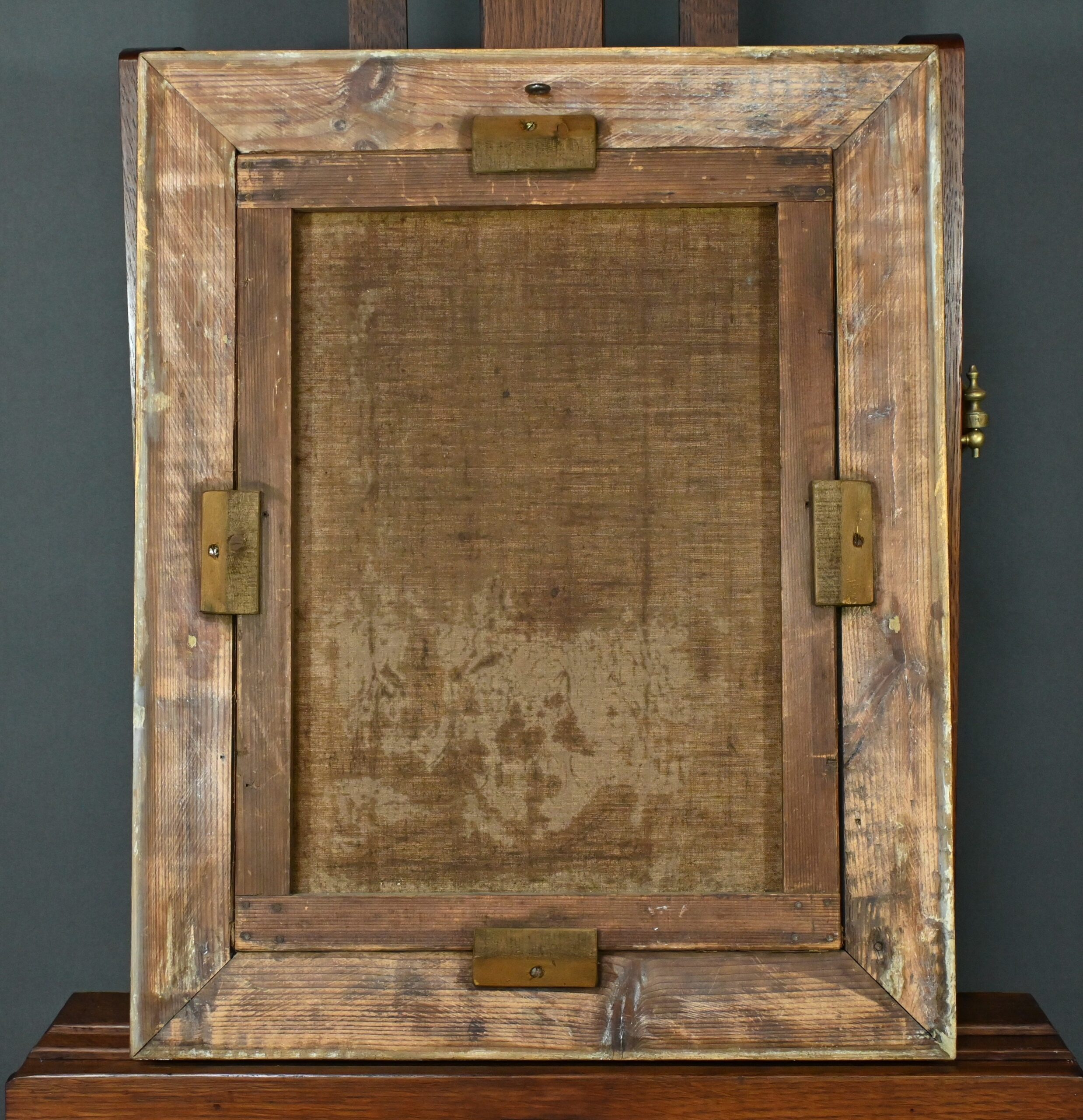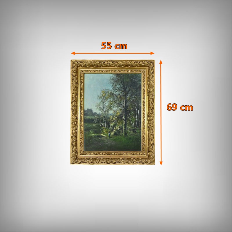 Le ciel, légèrement nuageux, ajoute une touche de réalisme sans assombrir la scène. Tout dans cette composition invite à la tranquillité : la lumière, les couleurs naturelles, la posture du promeneur. Le cadre doré, richement orné et mouluré, souligne le soin apporté cette œuvre.