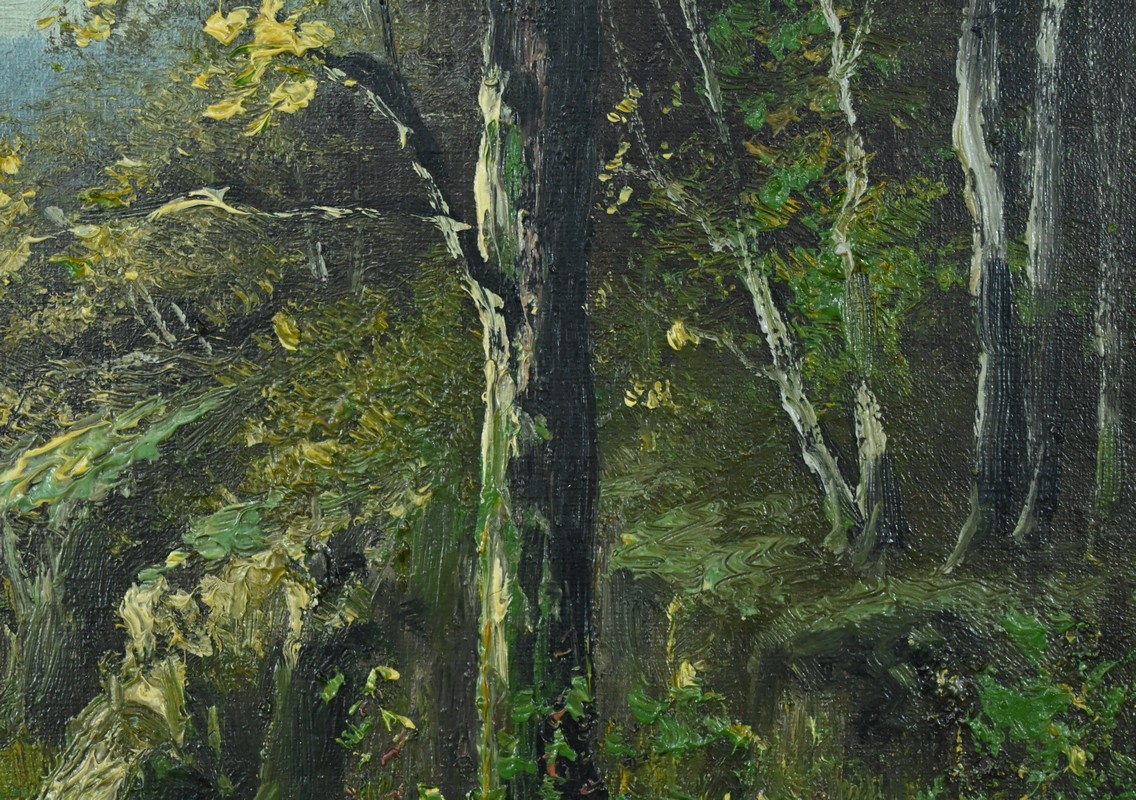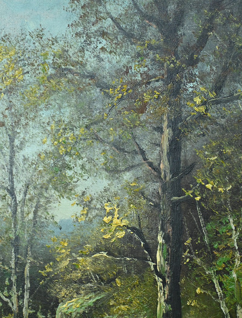Cette huile sur toile représente un chemin forestier bordé d’arbres, baigné d’une lumière douce qui filtre à travers les feuillages. La scène semble se dérouler en fin d’après-midi, lorsque le soleil rase les cimes et adoucit les couleurs.