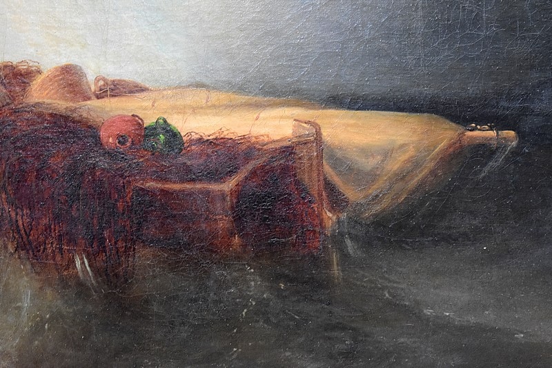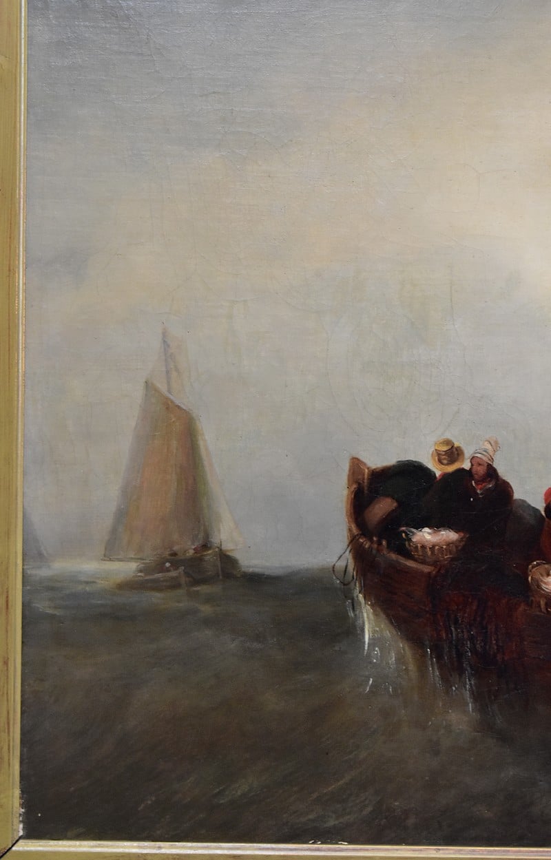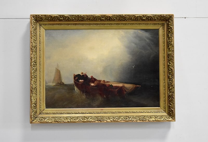 Tableau à l’huile sur toile non signé représentant une embarcation de pêcheurs se passant en pleine mer.