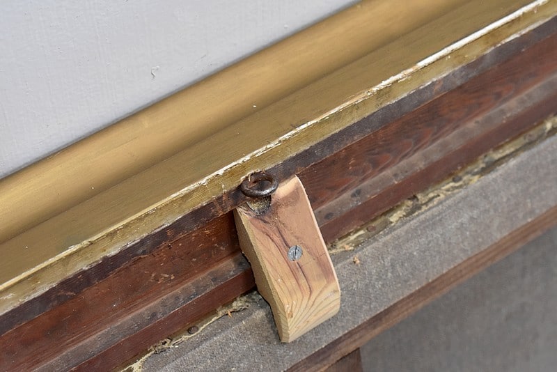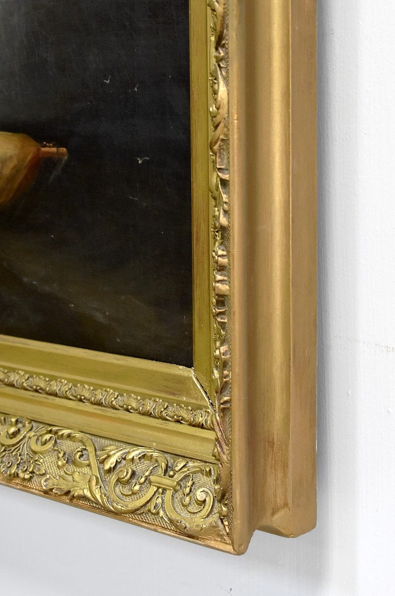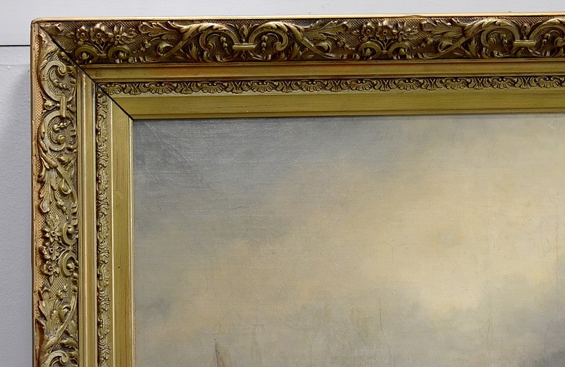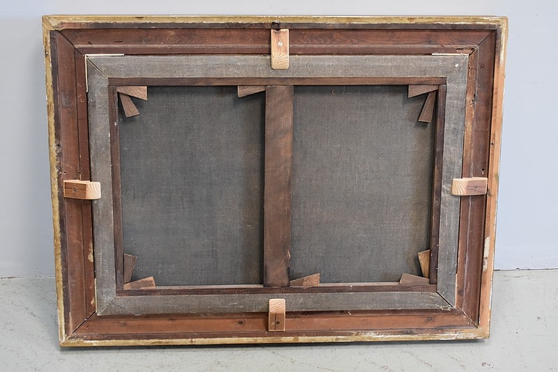 Il est encadré en bois doré, mouluré et sculpté de rinceaux sur fond en croisillons.