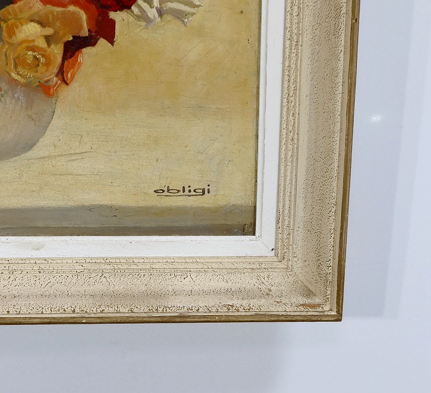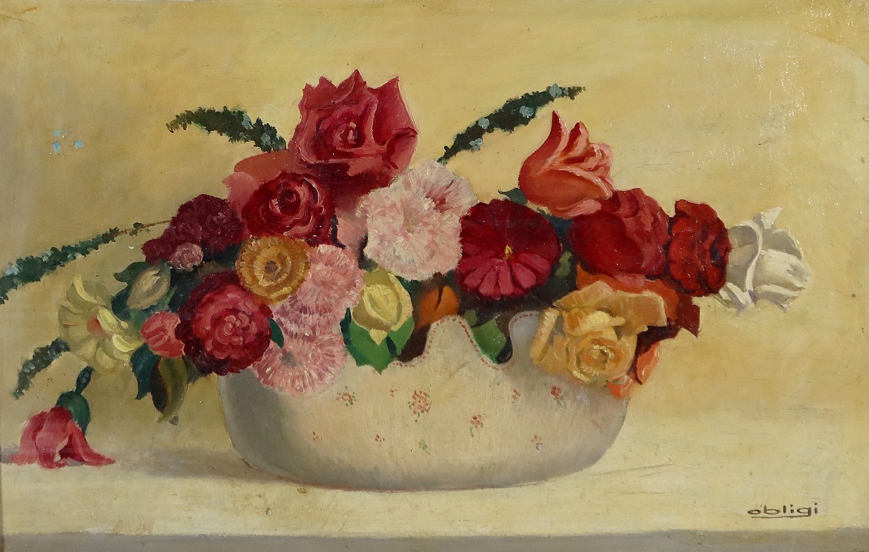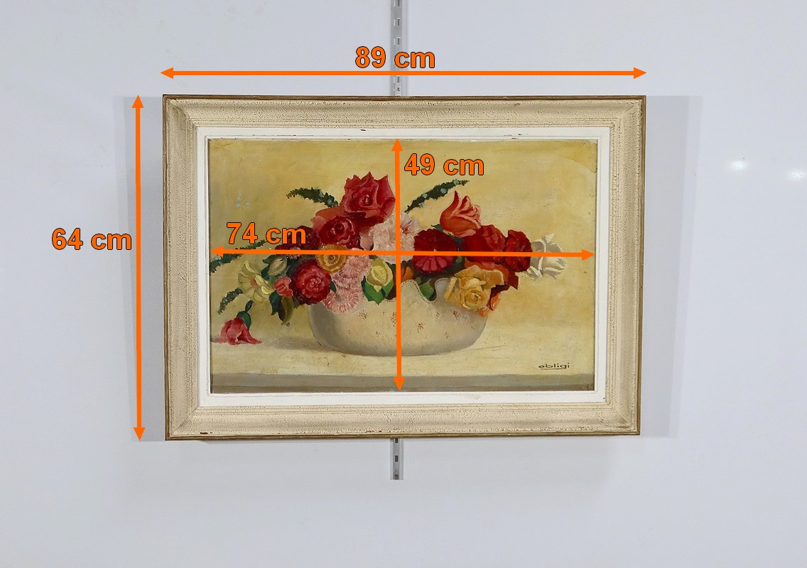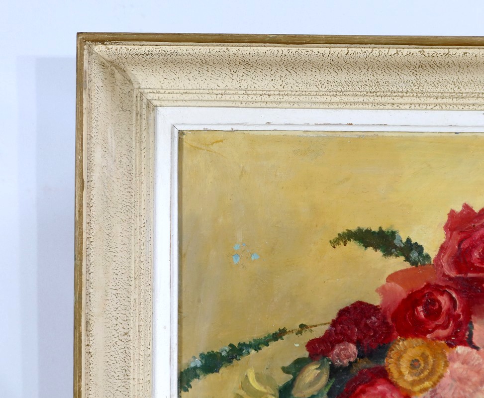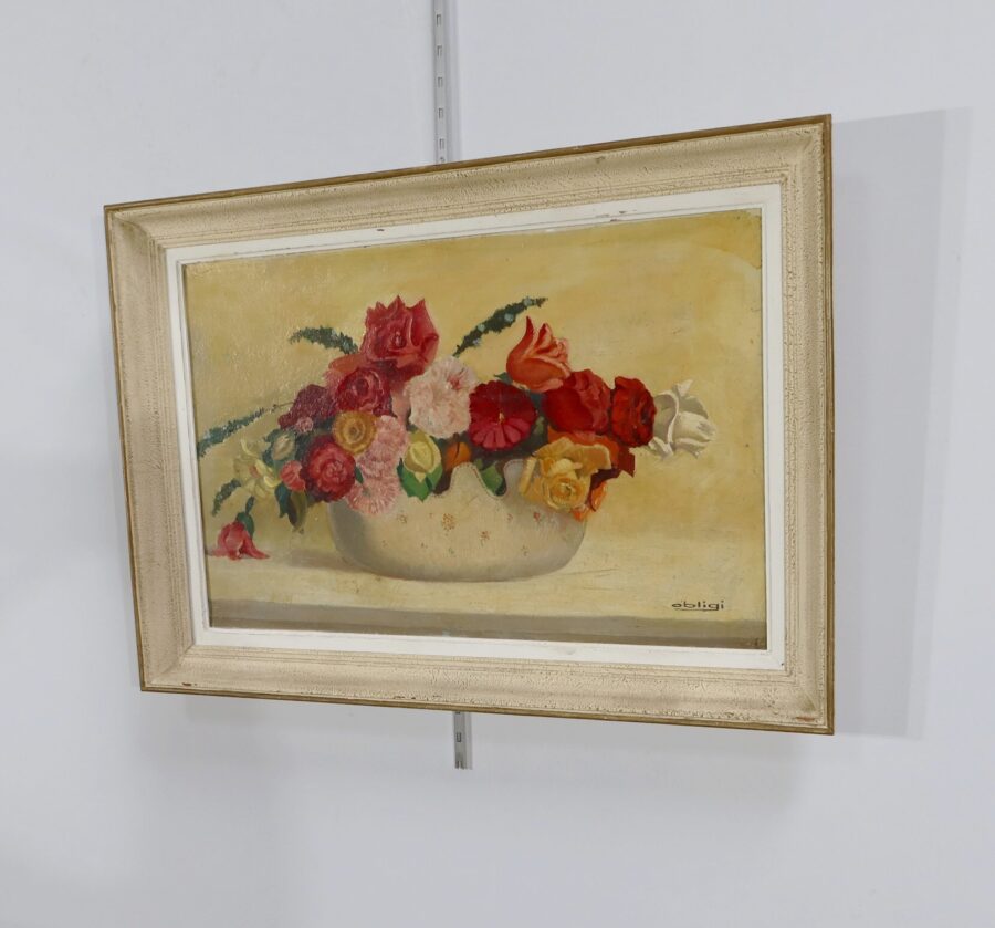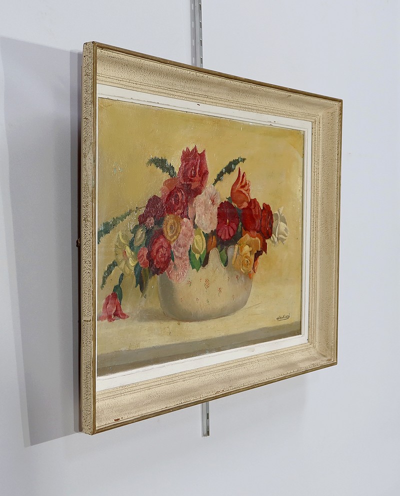 Grande Huile sur Panneau représentant une nature morte figurant un bouquet de fleurs dans un pot.