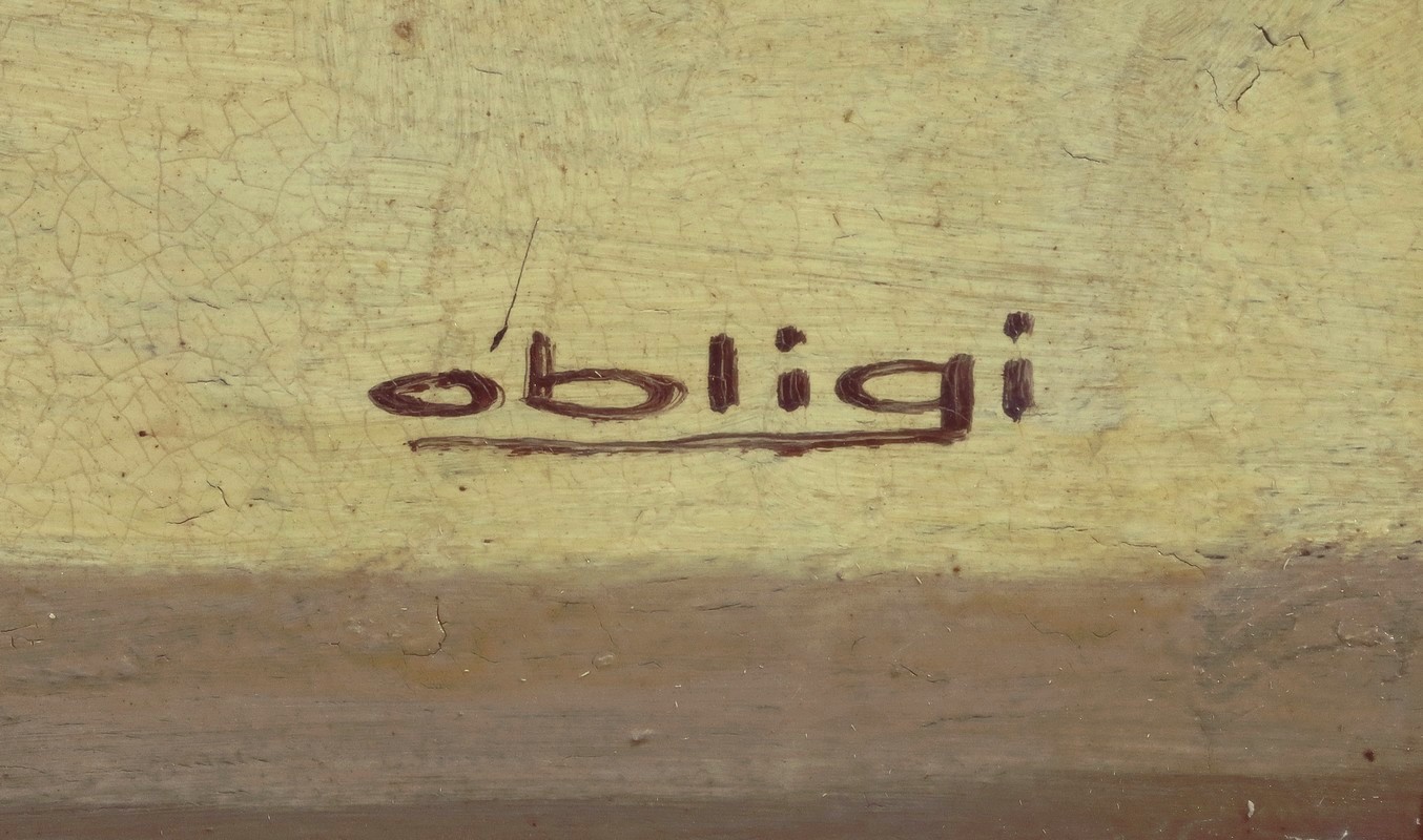 Cette grande huile sur panneau est entourée sobrement d’un cadre en bois peint mouluré.