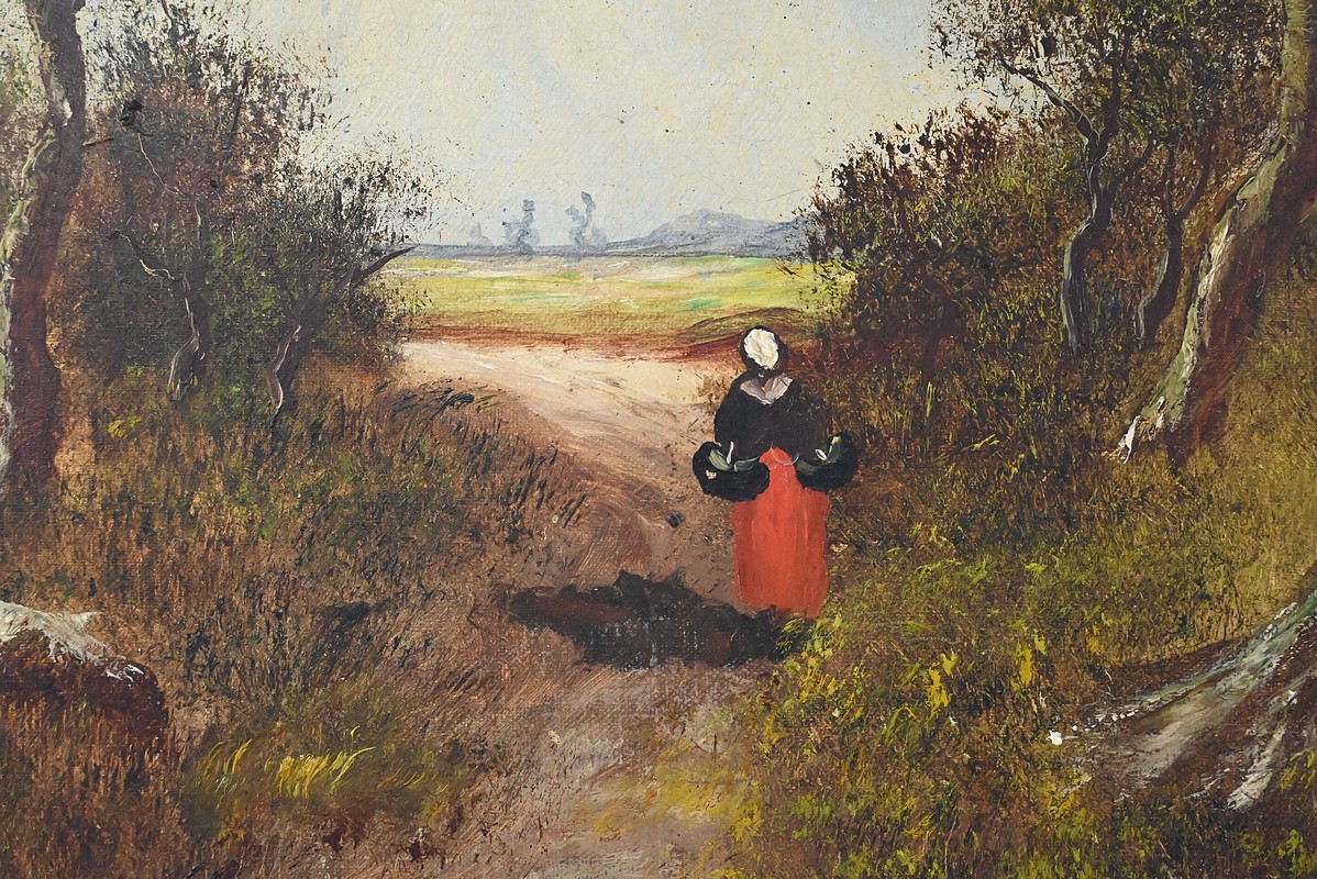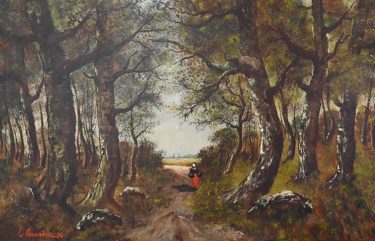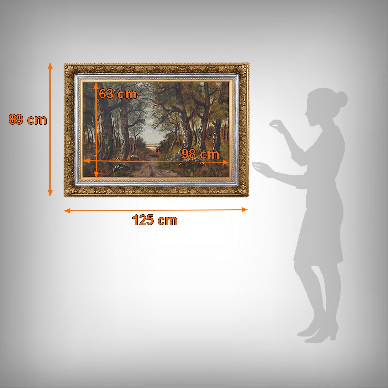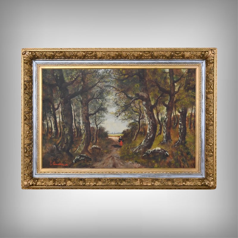 Dans cette grande huile sur toile datée de 1896, Lucie Gourdon déploie toute la délicatesse de son regard naturaliste en orchestrant une scène de sous‑bois où la lumière filtre avec douceur à travers les hautes frondaisons. Le chemin s’ouvre comme une invitation à la rêverie, guidant l’œil vers un champ lumineux où la nature semble respirer dans un calme profond. Les arbres, aux troncs élancés et légèrement courbés, composent une architecture végétale presque théâtrale, tandis que la figure féminine avançant au cœur du sentier apporte une présence discrète, humaine et poétique, qui accentue la profondeur narrative du paysage.