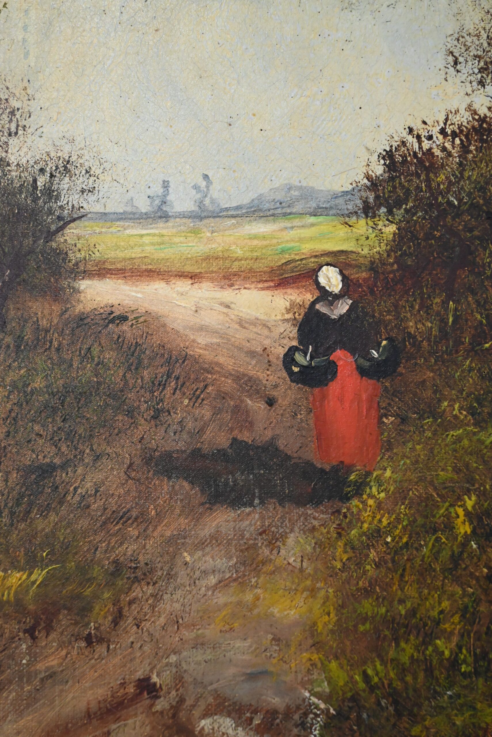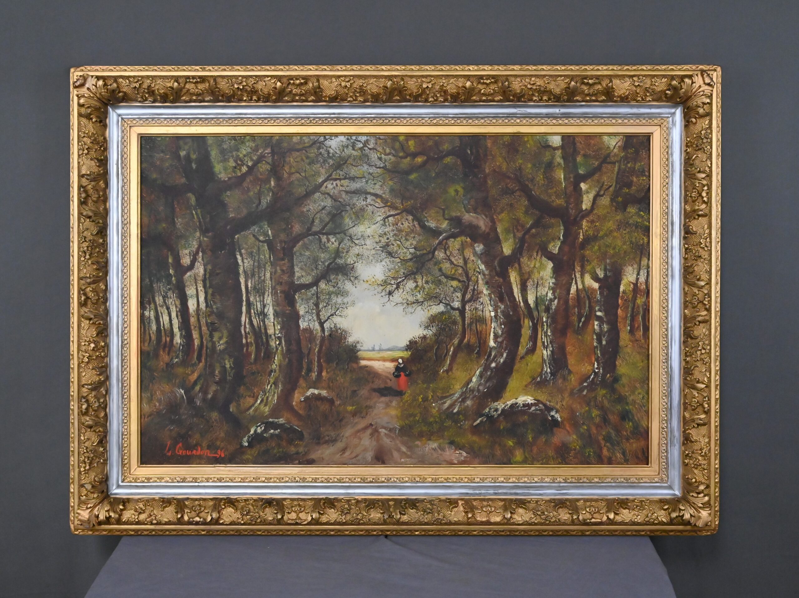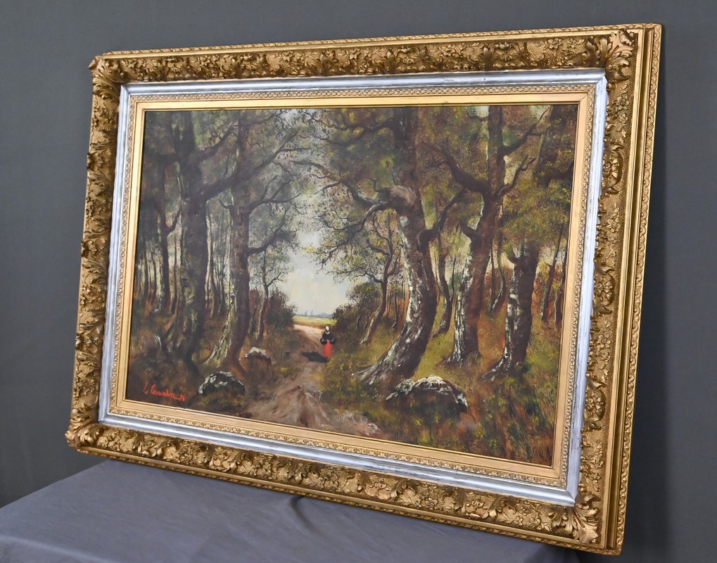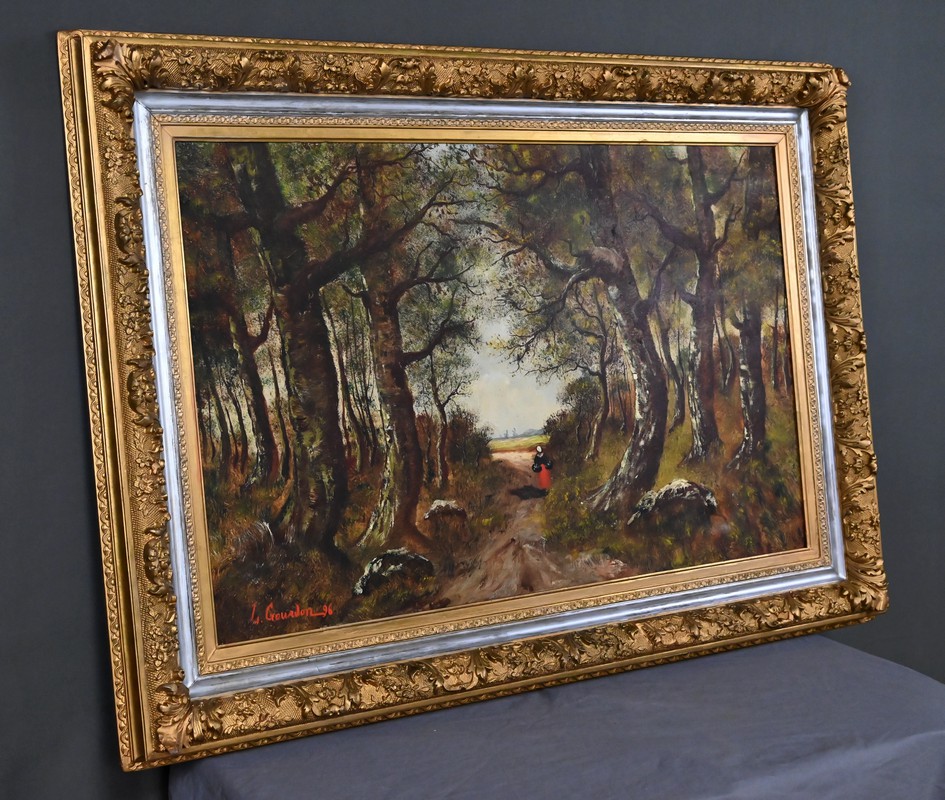 Dans cette grande huile sur toile datée de 1896, Lucie Gourdon déploie toute la délicatesse de son regard naturaliste en orchestrant une scène de sous‑bois où la lumière filtre avec douceur à travers les hautes frondaisons. Le chemin s’ouvre comme une invitation à la rêverie, guidant l’œil vers un champ lumineux où la nature semble respirer dans un calme profond. Les arbres, aux troncs élancés et légèrement courbés, composent une architecture végétale presque théâtrale, tandis que la figure féminine avançant au cœur du sentier apporte une présence discrète, humaine et poétique, qui accentue la profondeur narrative du paysage.