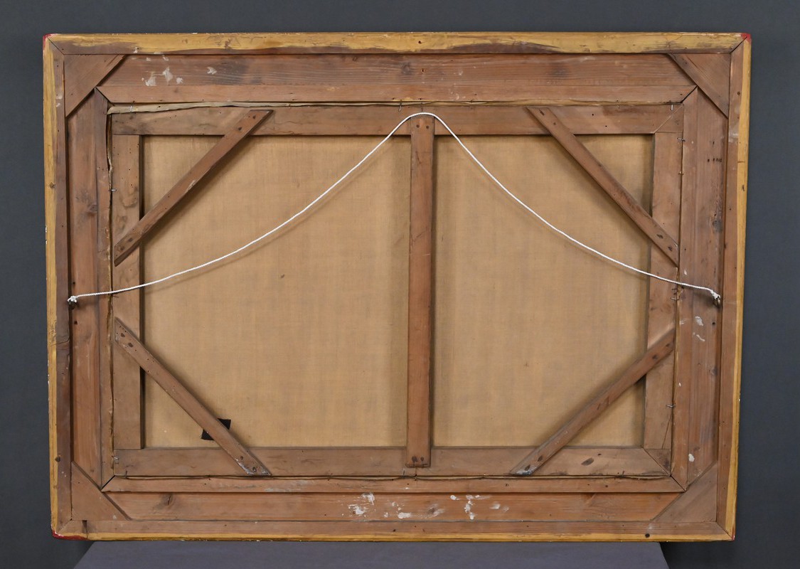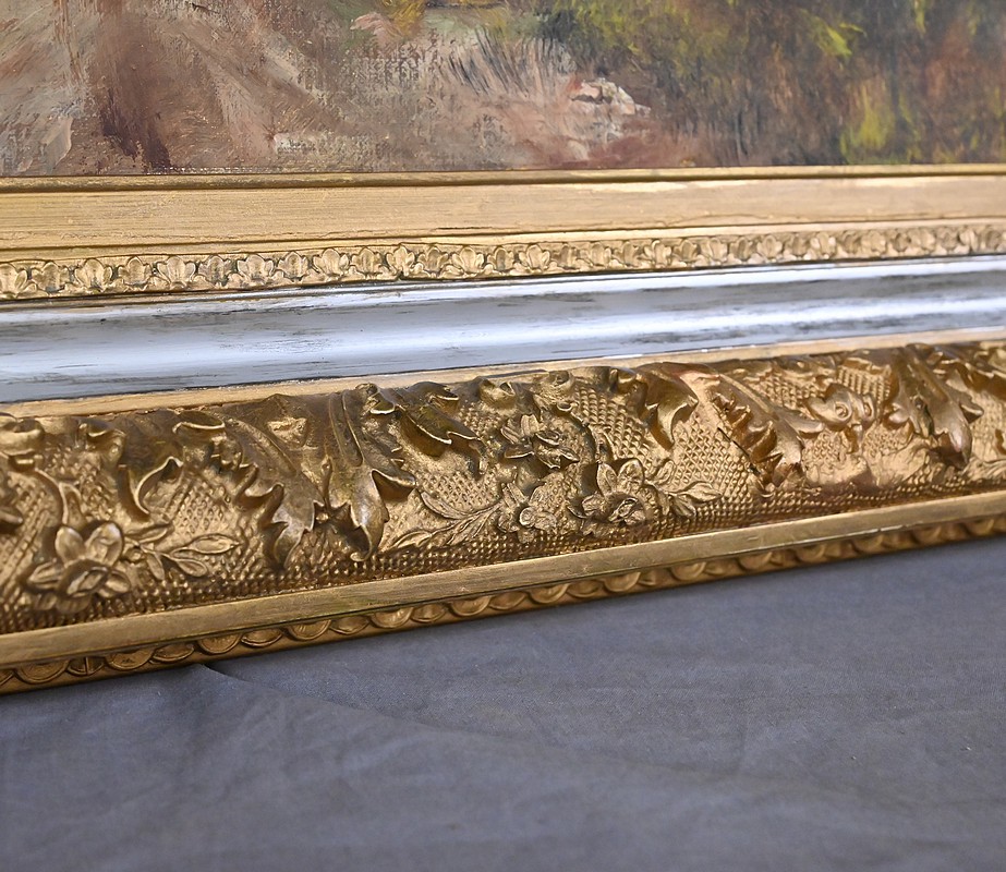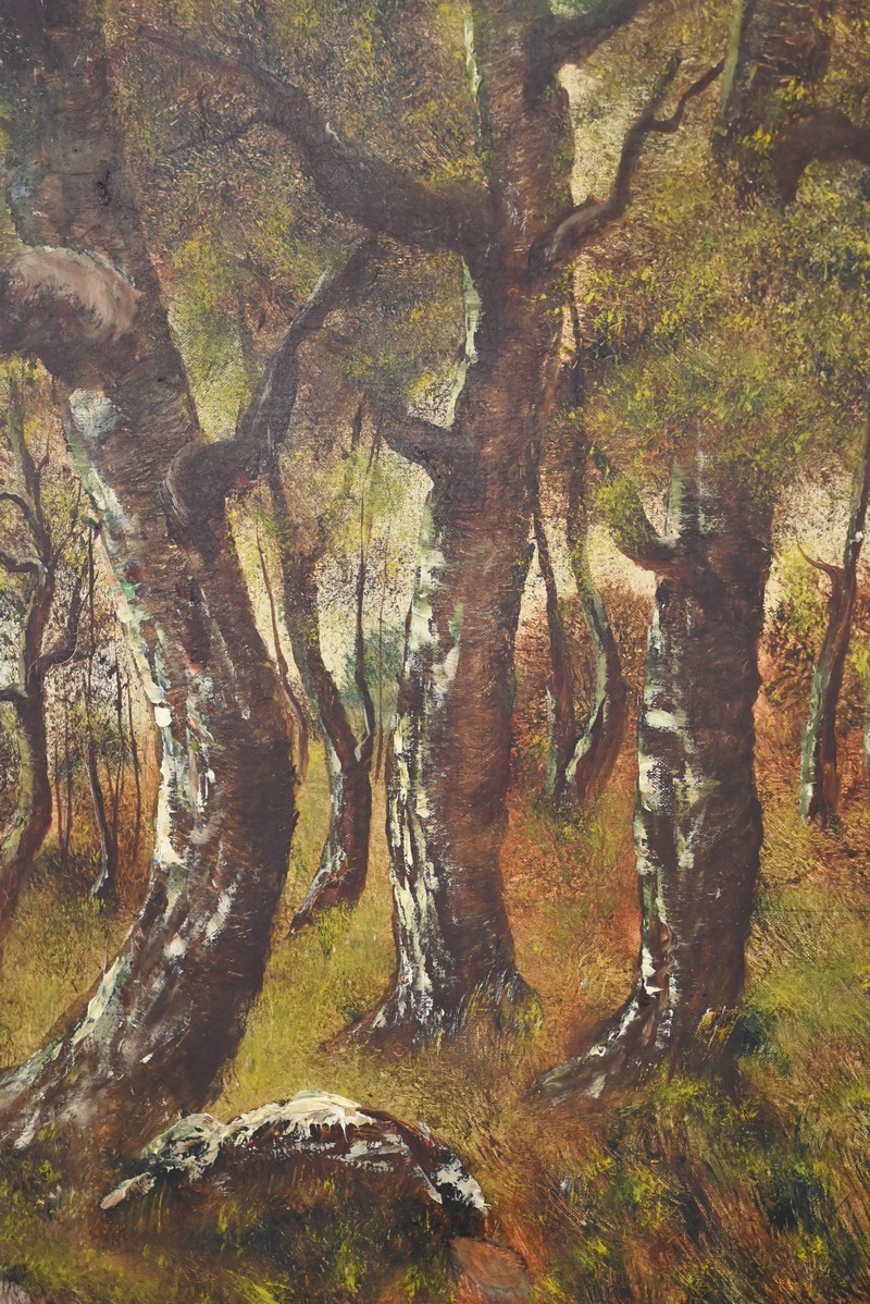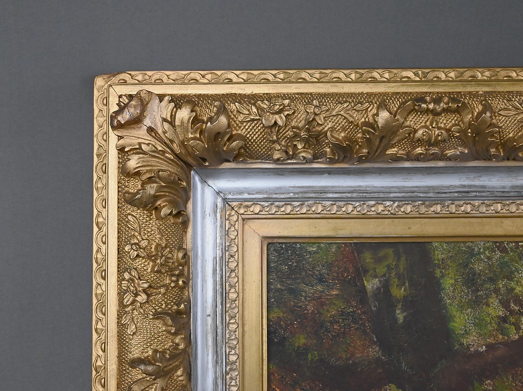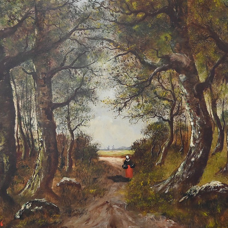 La palette, subtilement modulée de verts, d’ocres et de bruns chauds, révèle la maîtrise de l’artiste dans le rendu des atmosphères boisées et des transitions lumineuses. Chaque touche, précise et sensible, témoigne de l’héritage de la tradition paysagiste française de la fin du XIXᵉ siècle, dans une veine proche de Barbizon mais empreinte d’une douceur personnelle. L’ensemble dégage une harmonie rare, où la nature se fait refuge, scène vivante et espace de contemplation.