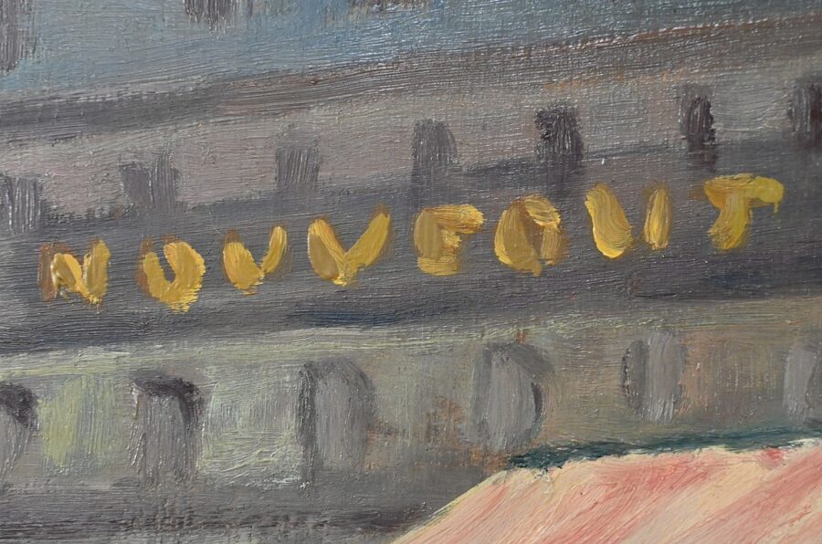 L’artiste capture avec délicatesse l’animation quotidienne, jouant subtilement des touches de couleur et de lumière pour faire vibrer la scène. La composition met également en valeur l’architecture pleine de charme des immeubles de la Belle Époque, notamment avec les inscriptions jaunes qui attire l’œil.