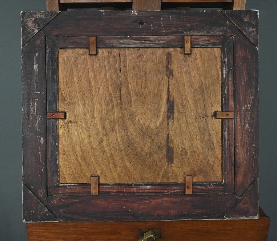 Le cadre ornementé, riche en motifs sculptés et patinés, encadre avec élégance cette œuvre pleine de vie, entre réalisme poétique et regard attendri sur une scène de rue intemporelle.