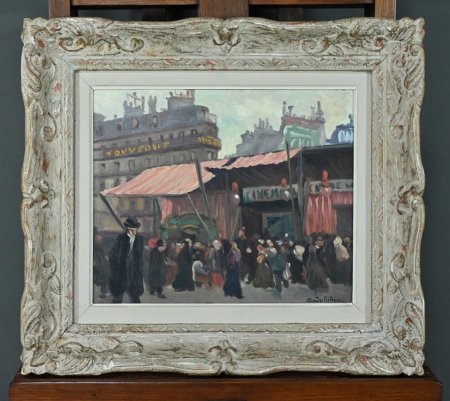 Cette huile sur panneau signée C. Subileau dépeint une scène urbaine vivante et empreinte de nostalgie, évoquant l’atmosphère d’un début de XXe siècle en effervescence. Dans une rue bordée d’enseignes, dont l’une proclame « Cinéma», suggérant l’essor du spectacle populaire, se pressent des passants habillés de manteaux et de chapeaux, témoins d’une époque révolue.