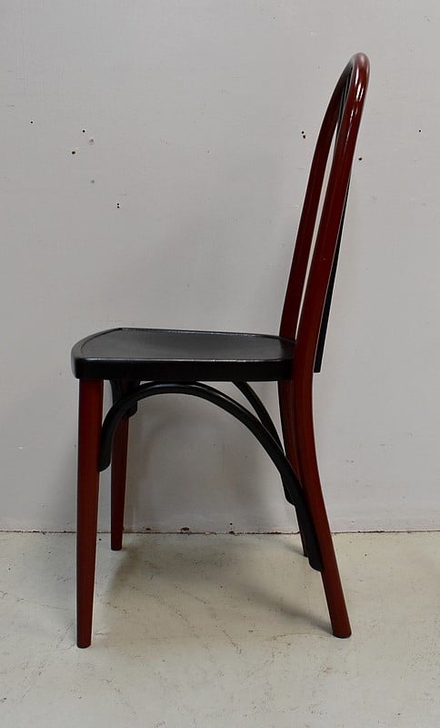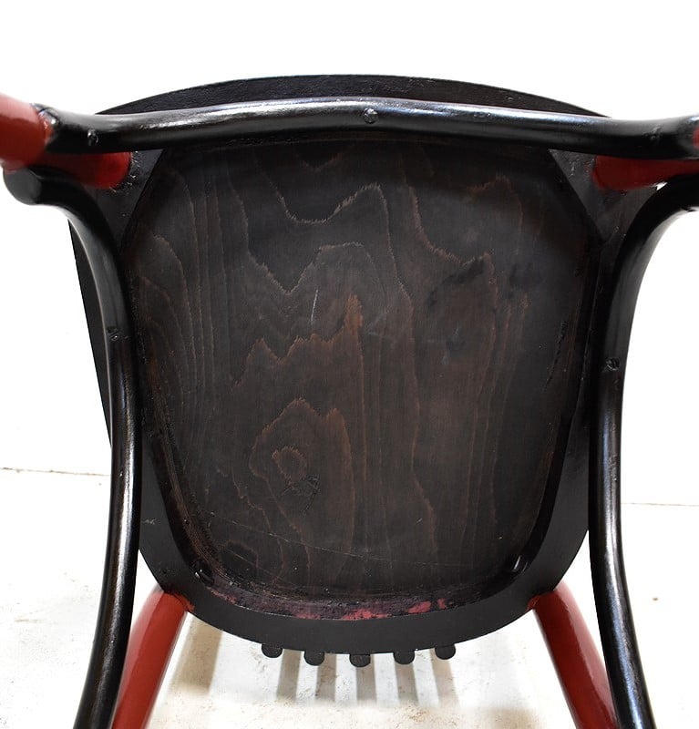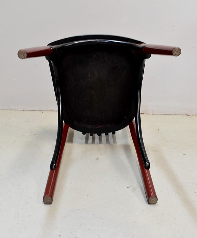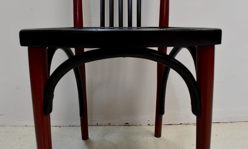 Chaise style Vintage en Bois, peint de Bordeaux pour l’armature principale du dossier ainsi que pour les pieds, de Noir pour le reste.