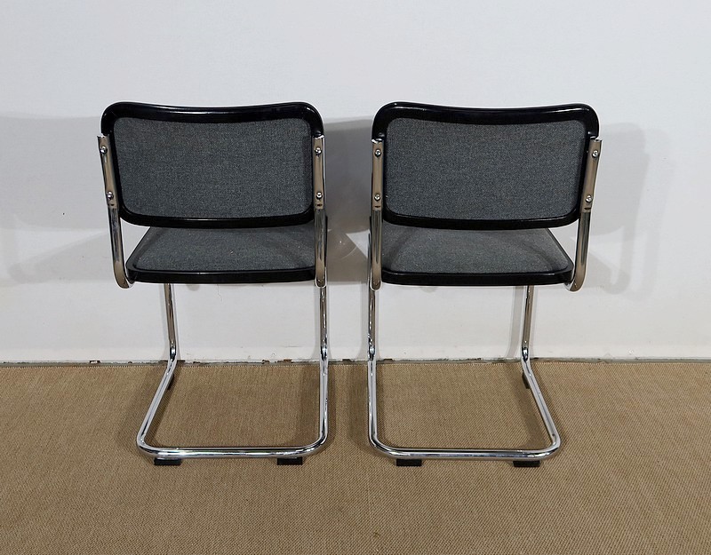 Belle paire de fauteuil modèle Cesca B32, dessiné par Marcel Breuer (1902-1981) dans les années 30 et réédité par la marque en 1991. Elles possèdent une numérotation et une signature gravée « Made in Italy » sur le bord noir en dessous de chaque siège.