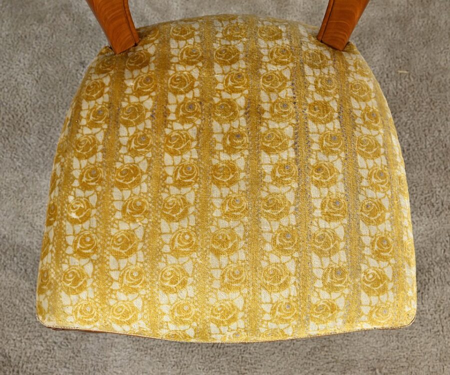 Paire de chaises en acajou blond d’époque Art Déco. Chaque chaise bénéficie d’un dossier en anse de panier cintré, sculpté en partie haute d’une garniture de fleurs et de feuillages. Ces chaises reposent sur des pieds avant cannelés en forme d’ogive allongée. Les pieds arrières sont tournés vers l’extérieur pour plus de stabilité. La structure est en parfait état et les assises d’origine sont habillées d’un velours jaune aux motifs floraux.