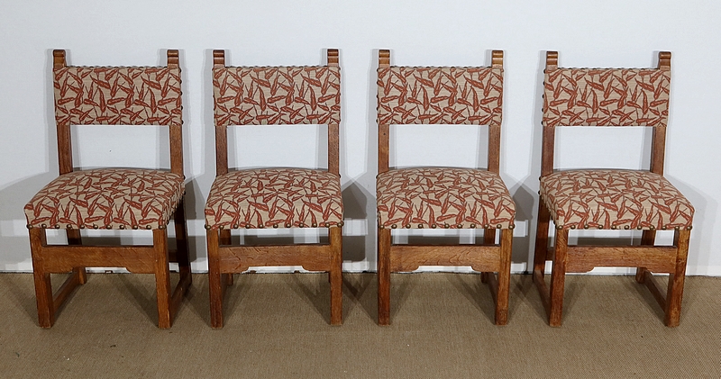 Suite de quatre chaises en chêne, robustes et confortables, en excellent état.