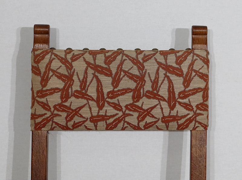 Chaque siège est pourvu d’une assise habillée d’un tissu gris clair agrémenté de feuillages lie de vin, avec des gros clous en laiton vieilli.