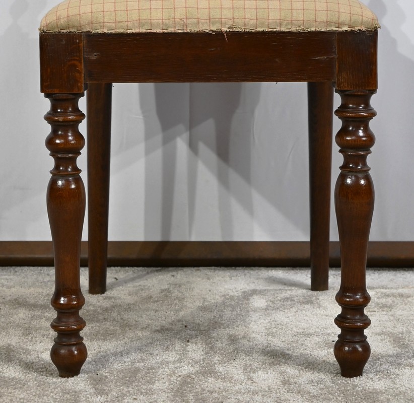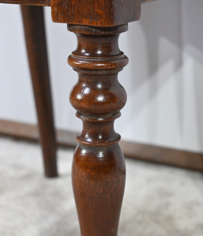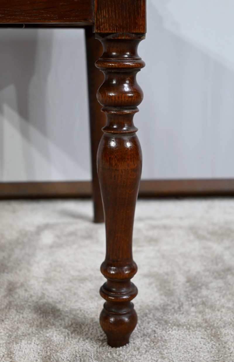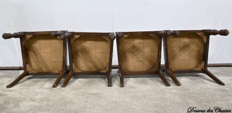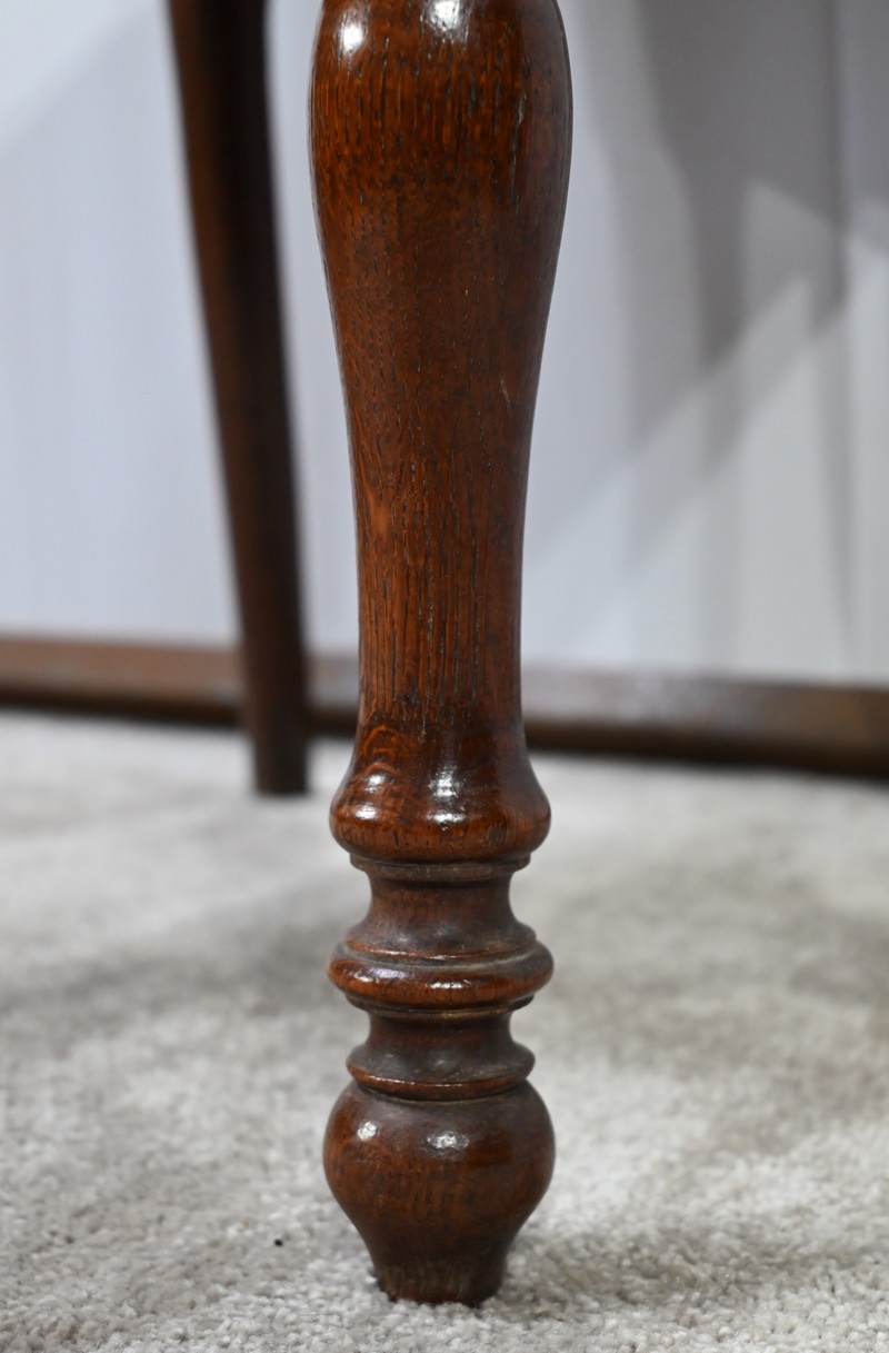 Ces chaises en chêne massif comportent chacune une large ceinture reposant sur deux pieds tournés à l’avant et deux pieds en coup de fouet à l’arrière.