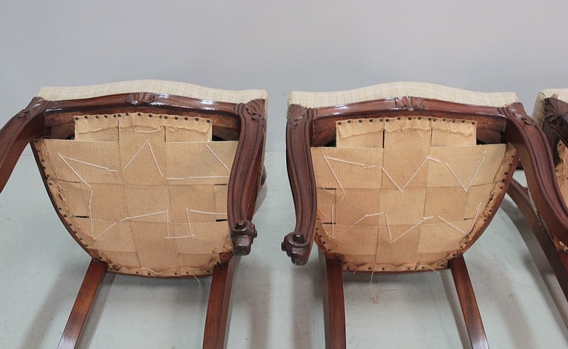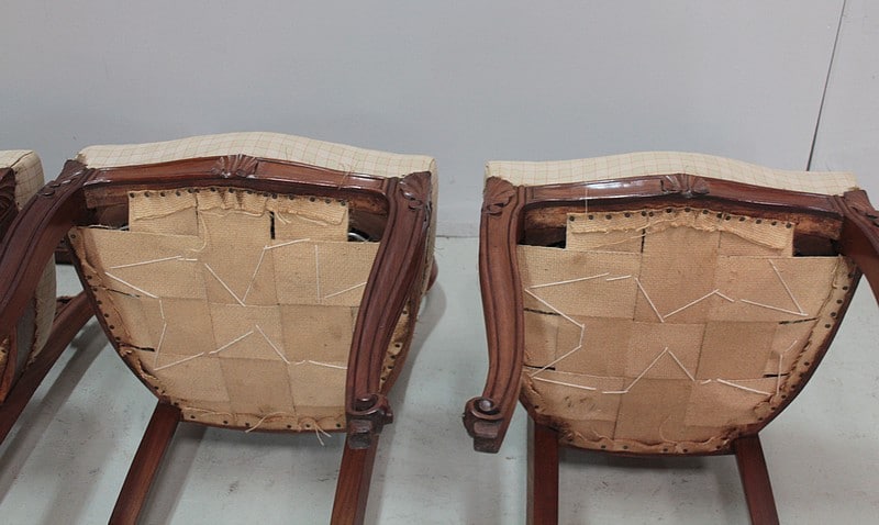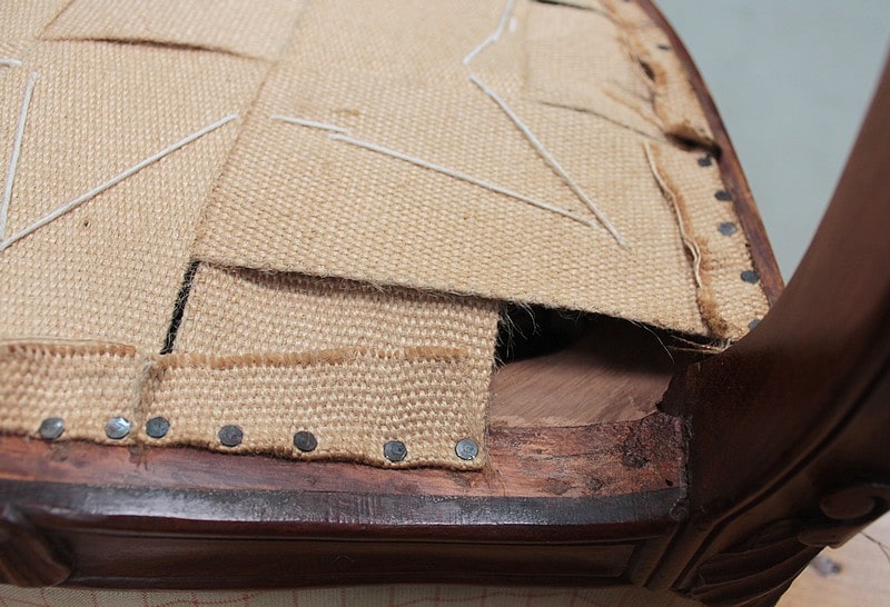 Les assises ont été refaites de façon traditionnelle, avec sangles, ressorts et crin, après équerrage. Il reste le tissu final à poser.