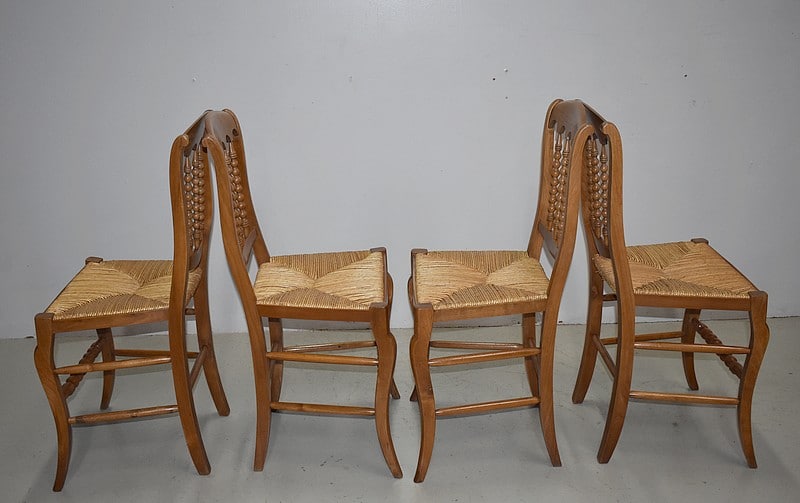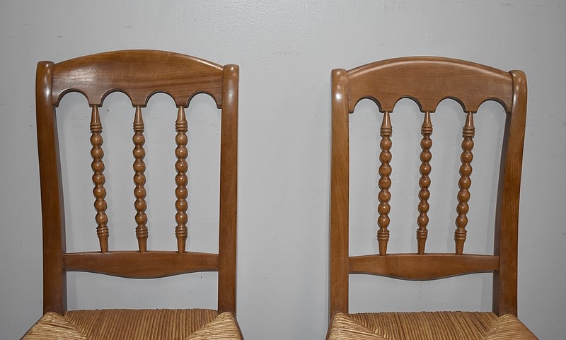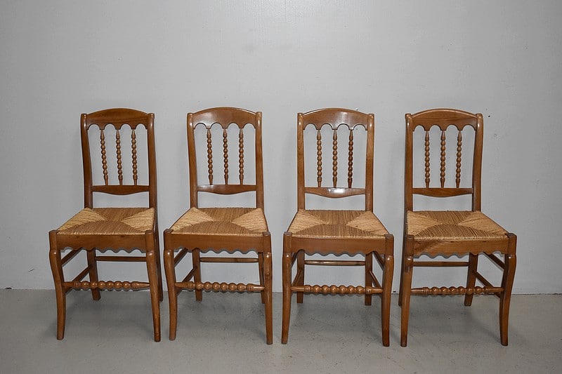 Suite de 4 élégantes chaises Restauration, esprit Cathédrale, en merisier blond. Les assises paillées ont été refaites. Les dossiers sont garnis de 3 barreaux tournés façon ‘chapelet’. La ceinture est mouvementée.