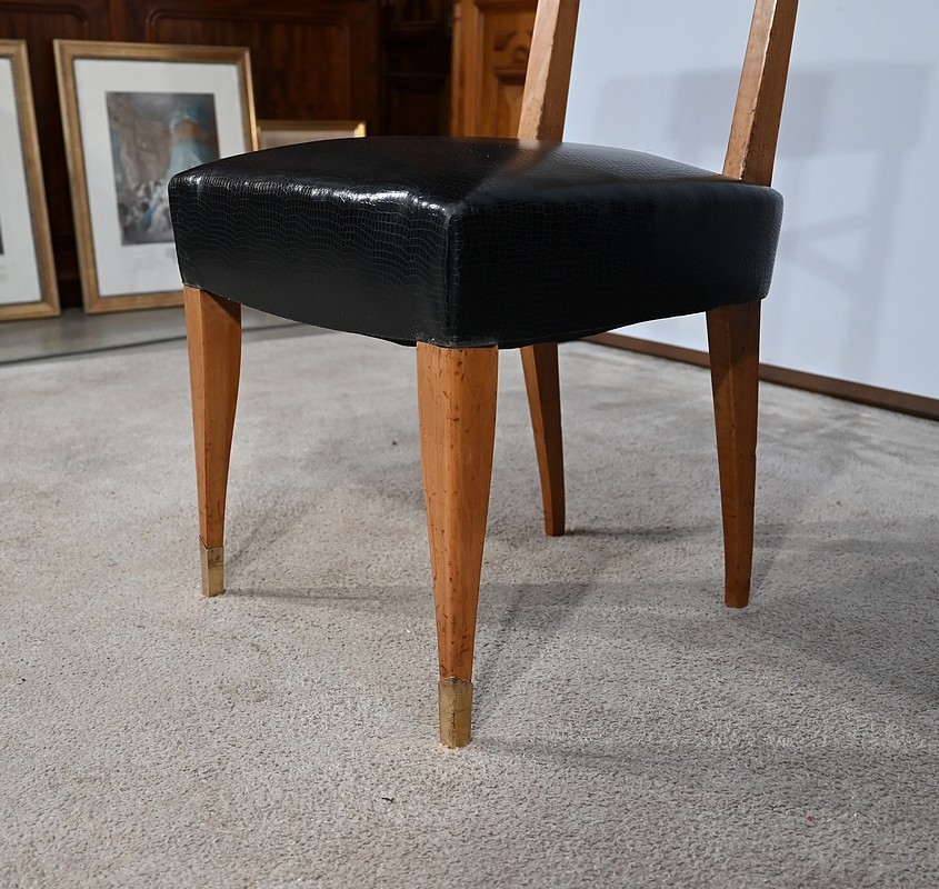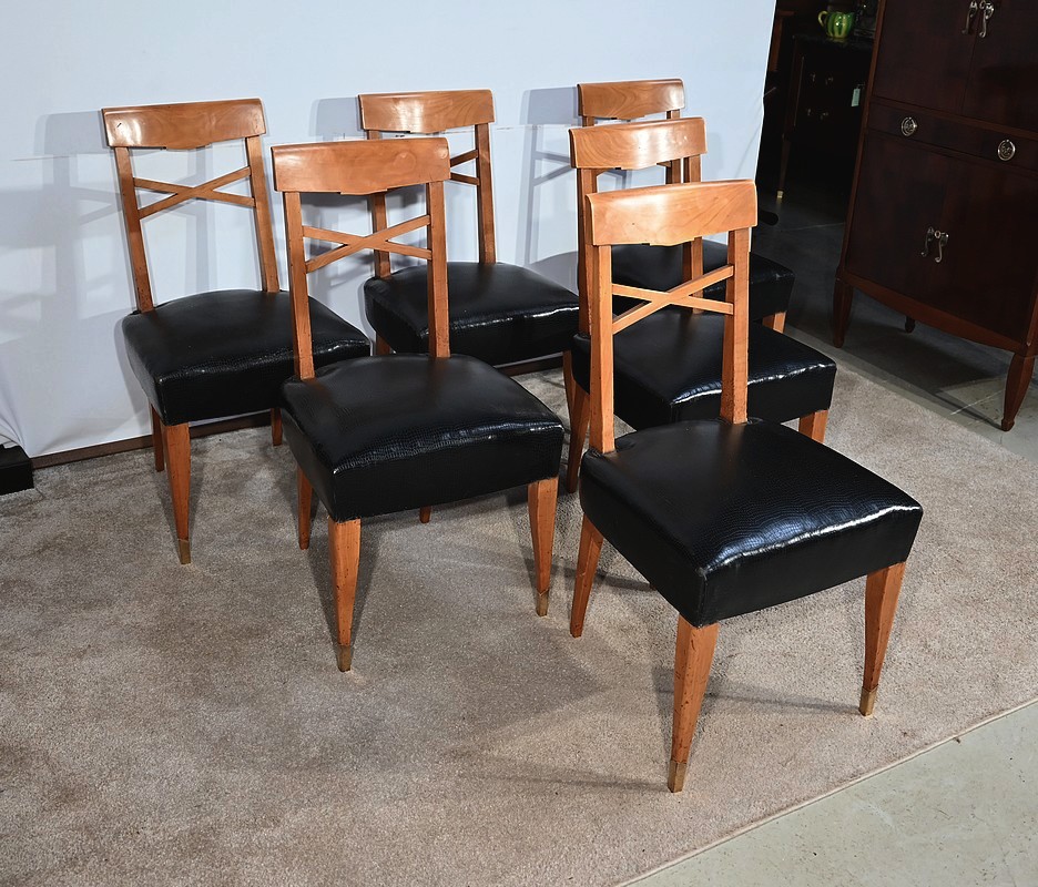 Belle suite de six chaises en merisier massif, d’époque Art Déco, se remarquant par l’étroitesse de leur dossier contrastant avec leur assise généreuse.