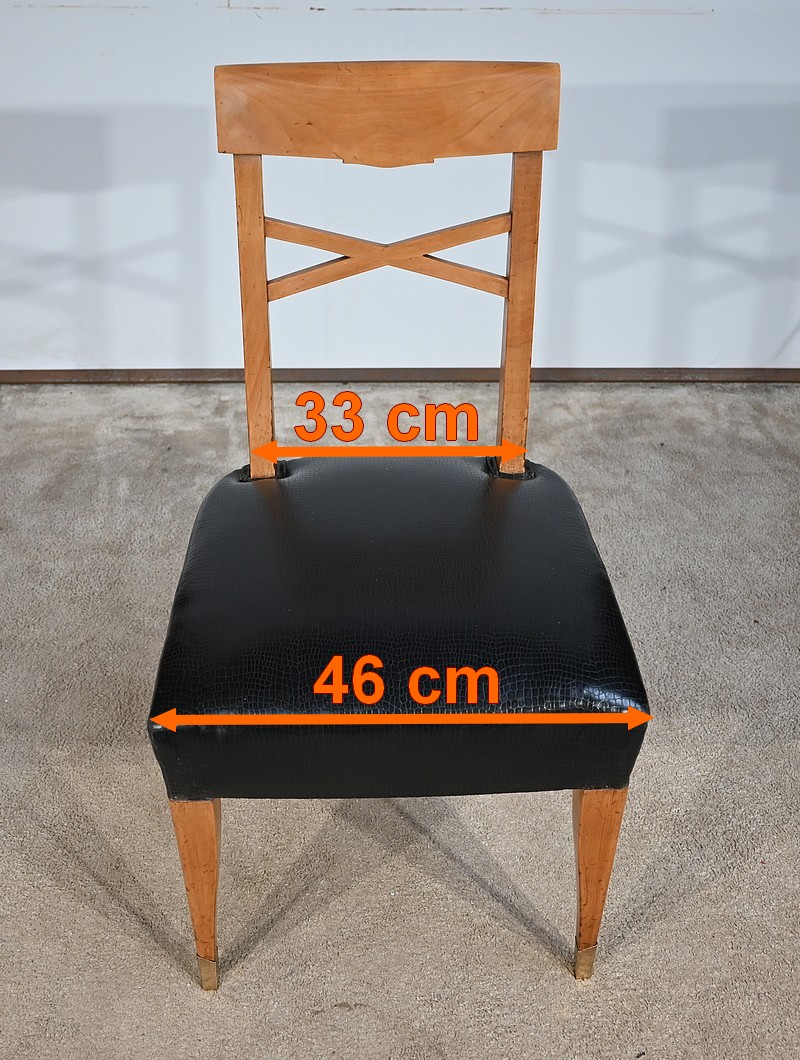 Chaque chaise repose sur des pieds de section carrée, s’affinant vers le bas et pourvus d’un habillage en laiton sur les quatre faces en partie basse.
