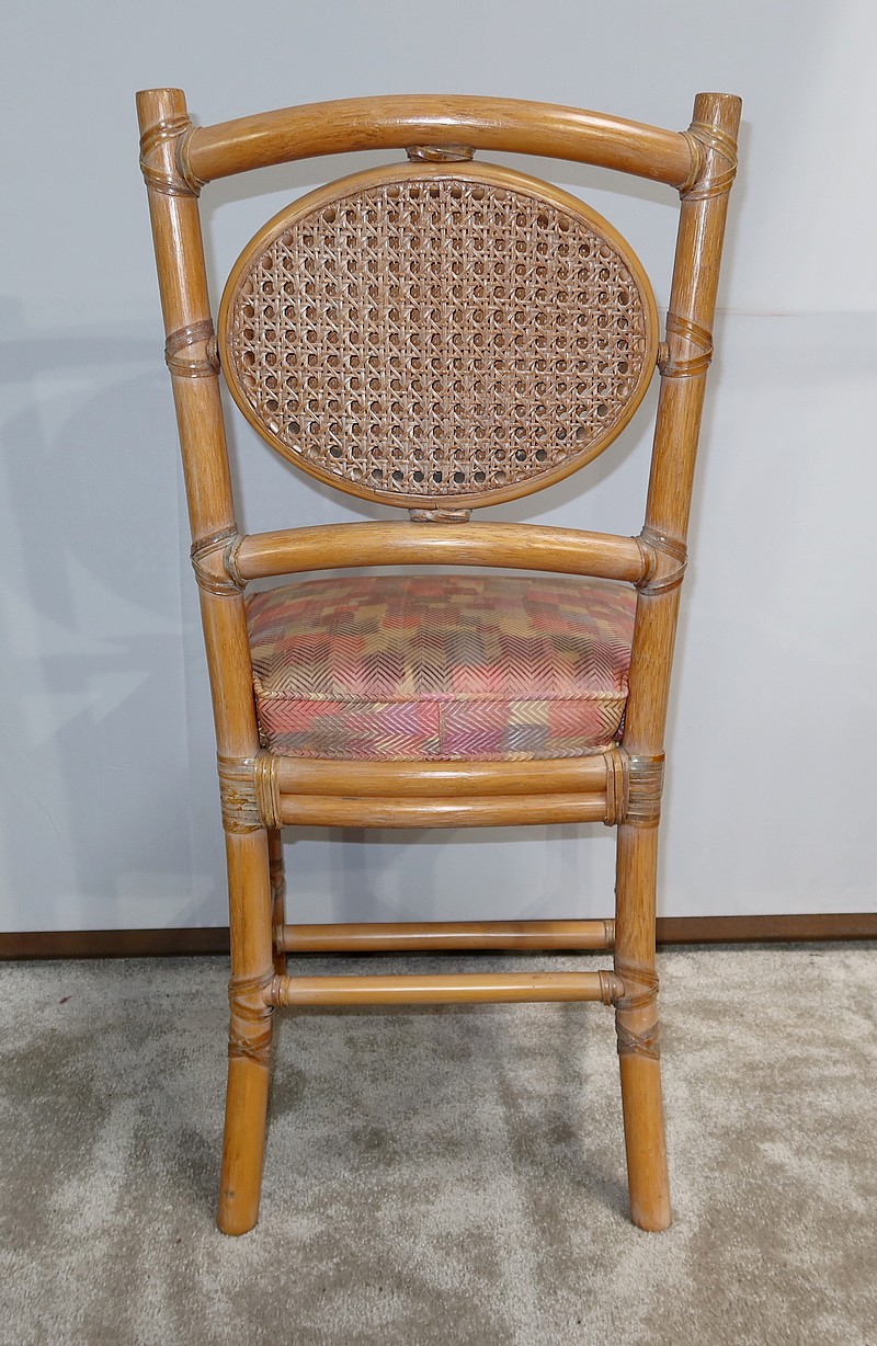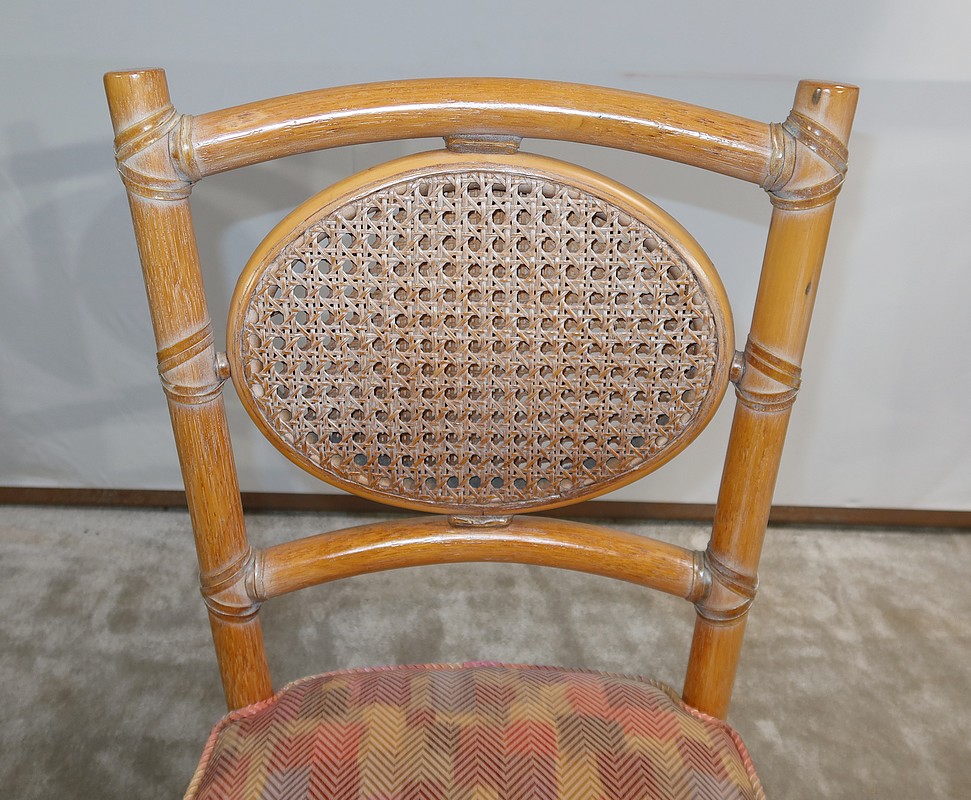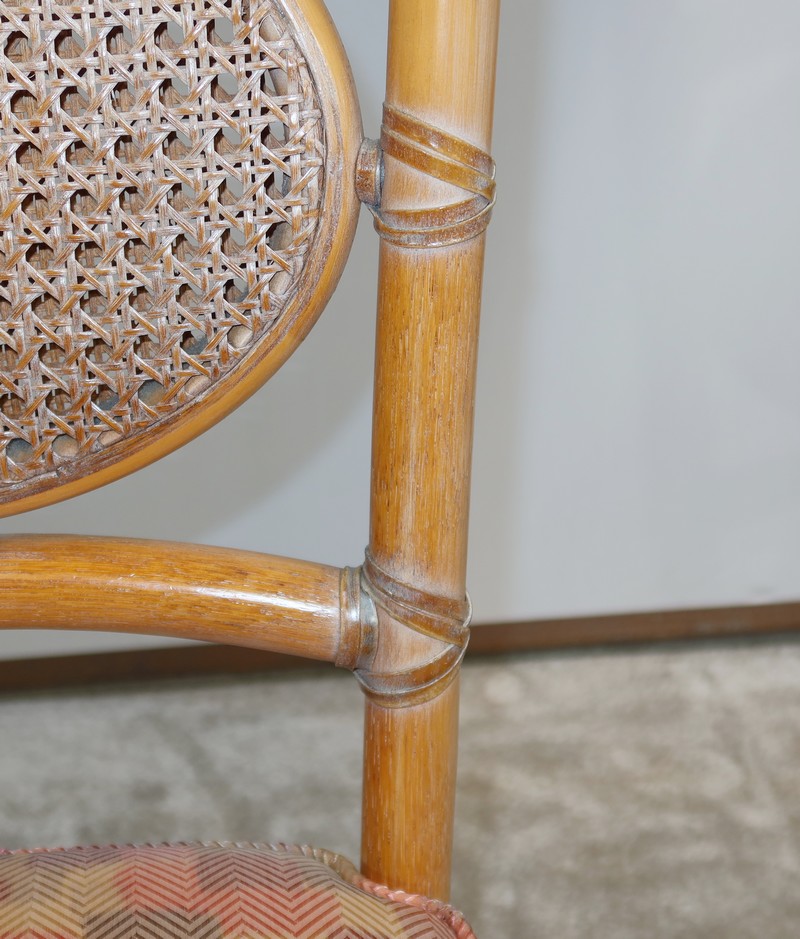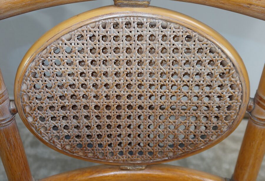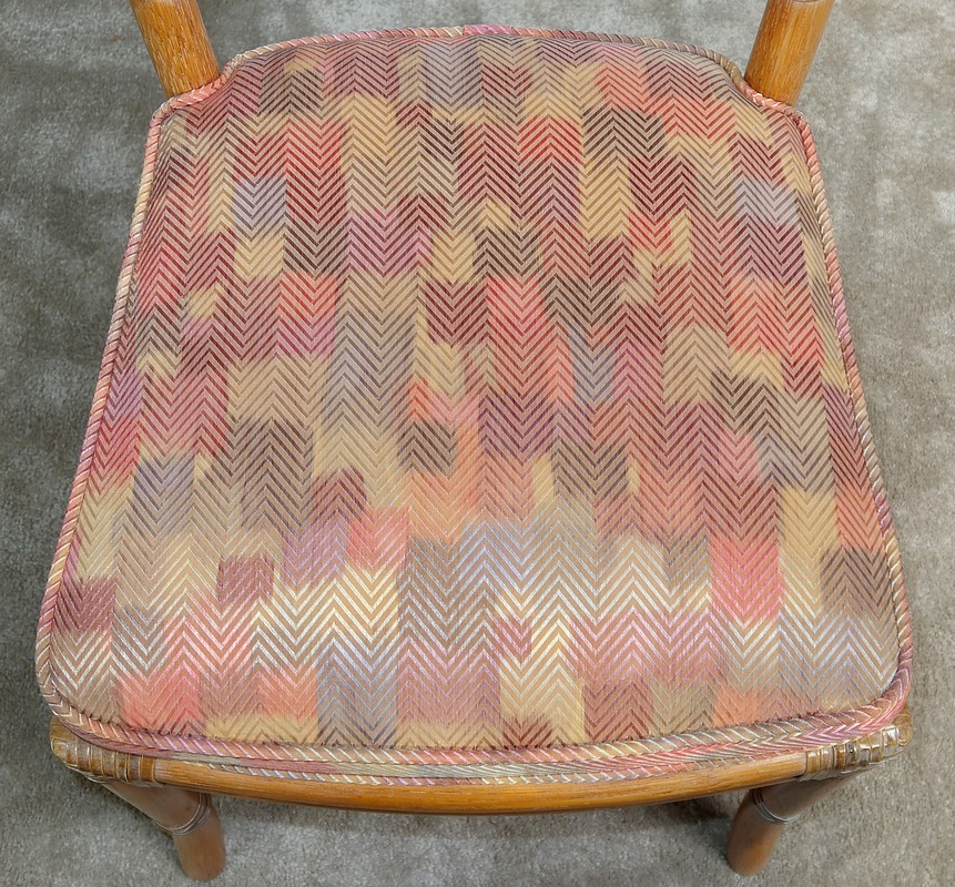 Ces chaises en frêne possèdent un dossier ajouré trapézoïdale muni d’un ovale composé d’un double cannage.