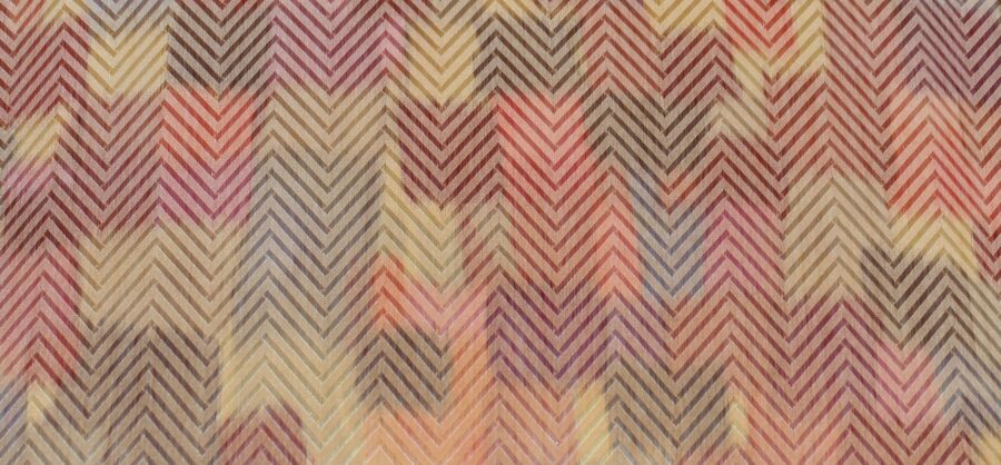 L’assise est habillée d’un tissu multicolore au design géométrique.