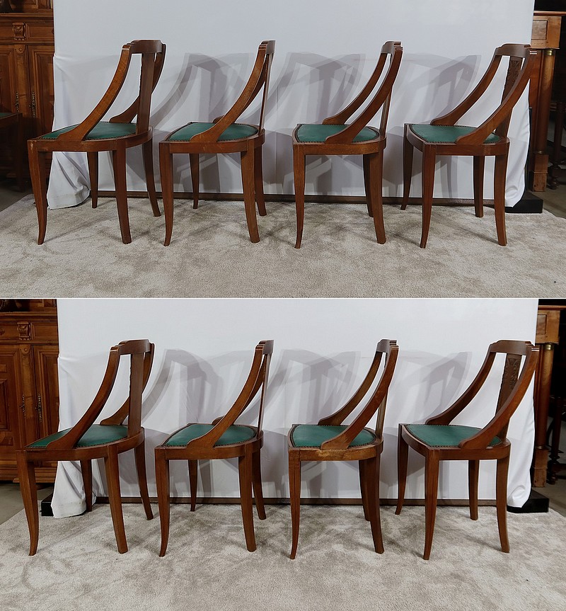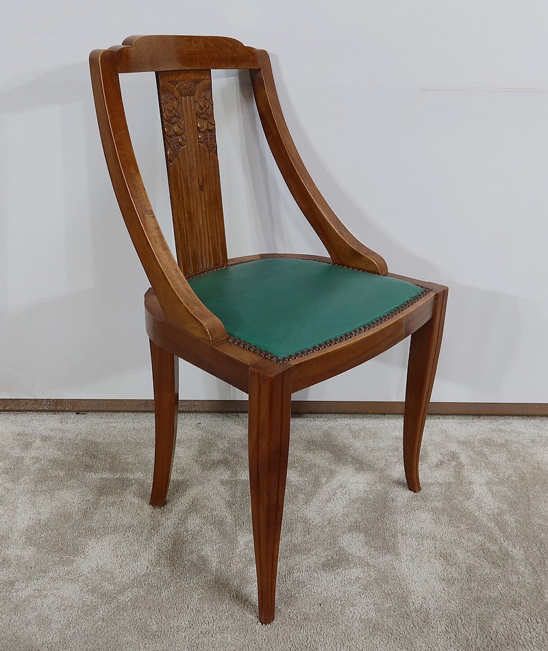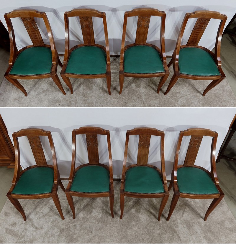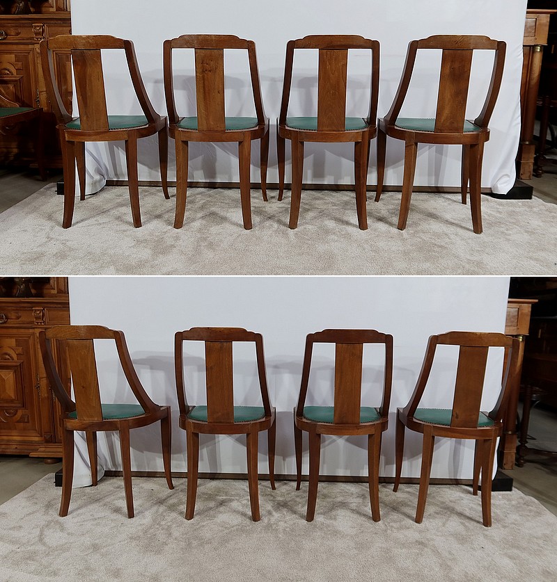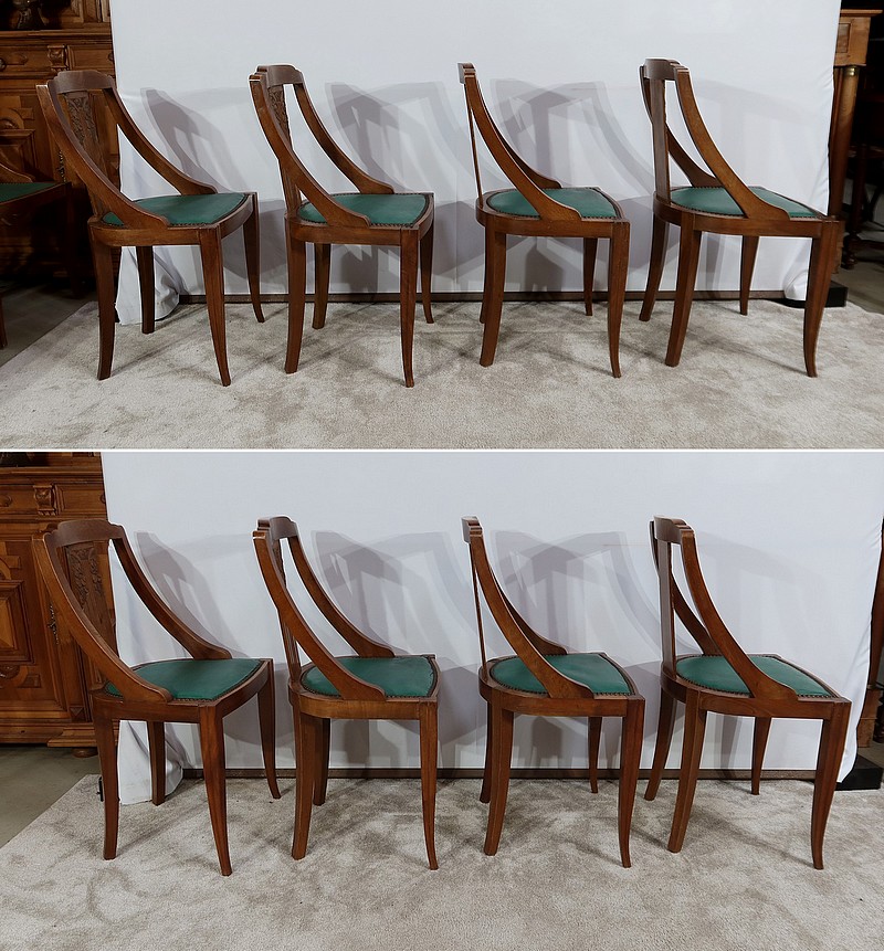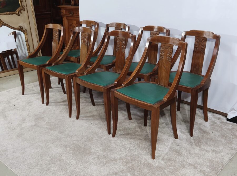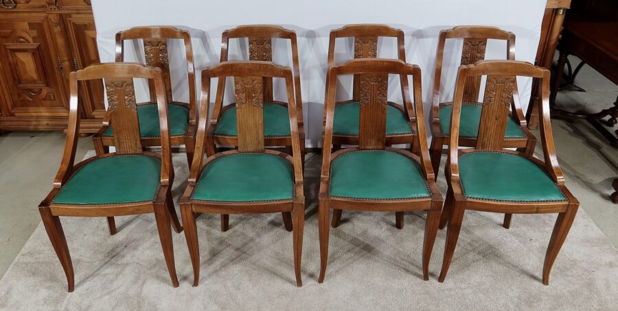 Bel ensemble de chaises en noyer massif, reposant à l’avant par deux pieds carrés à gaine, légèrement à mouvement vers le bas, avec striures. Les pieds arrière sont « sabres ».