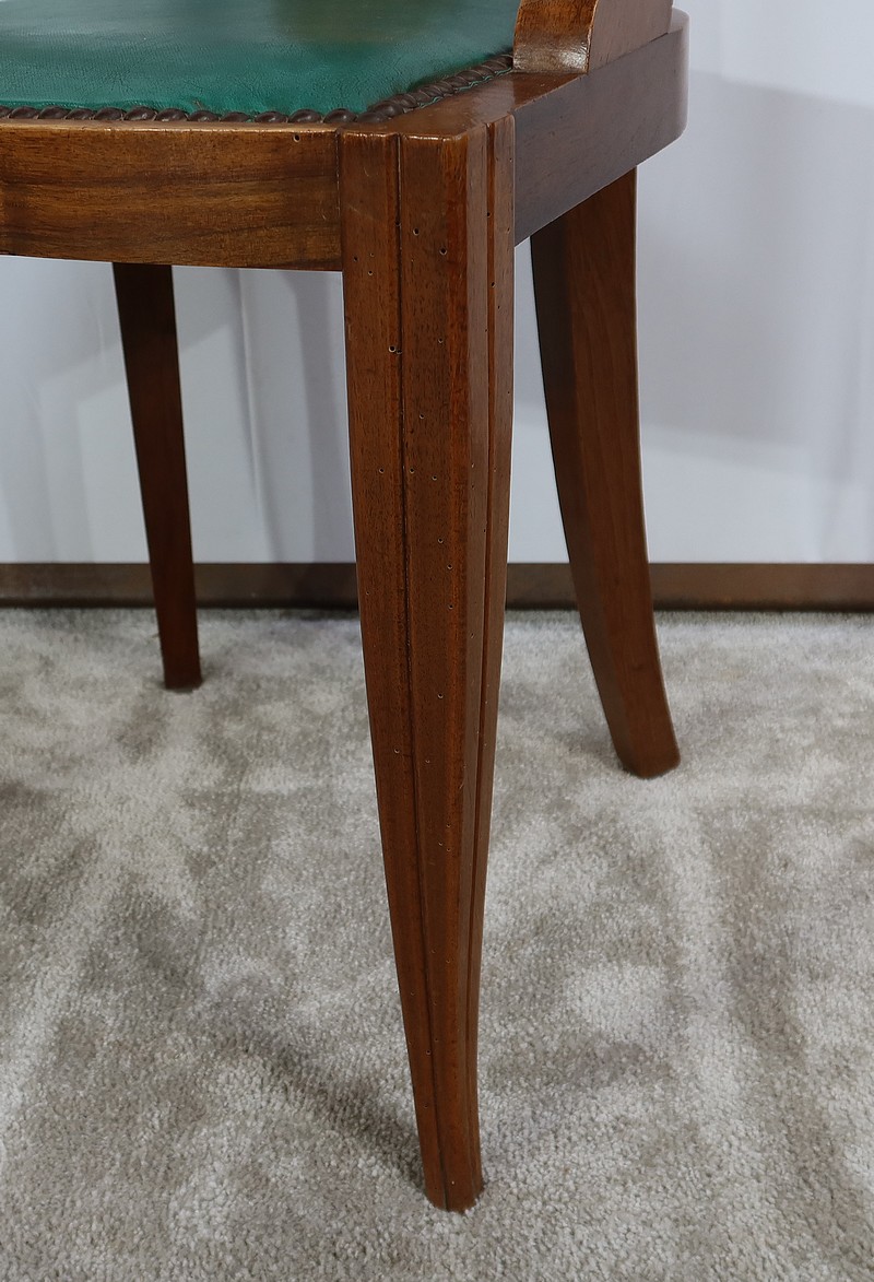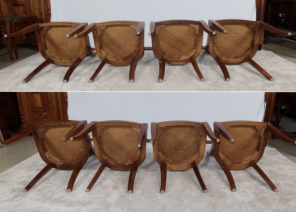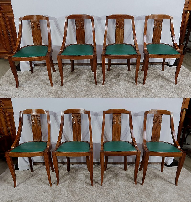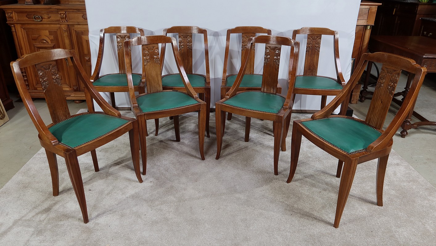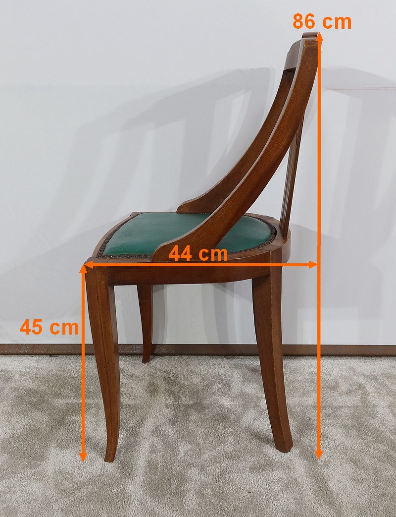 Bel ensemble de chaises en noyer massif, reposant à l’avant par deux pieds carrés à gaine, légèrement à mouvement vers le bas, avec striures. Les pieds arrière sont « sabres ».