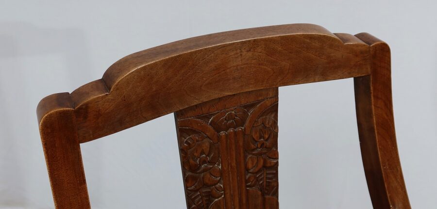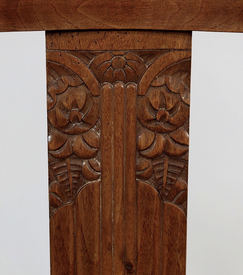 De chaque côté de la ceinture partent des éléments de bois rejoignant le haut du dossier, à découpe et à mouvement. Le dossier ajouré présente un large pilastre vertical en son centre. Il est gravé de fleurs et de décorations typiques du style art déco.