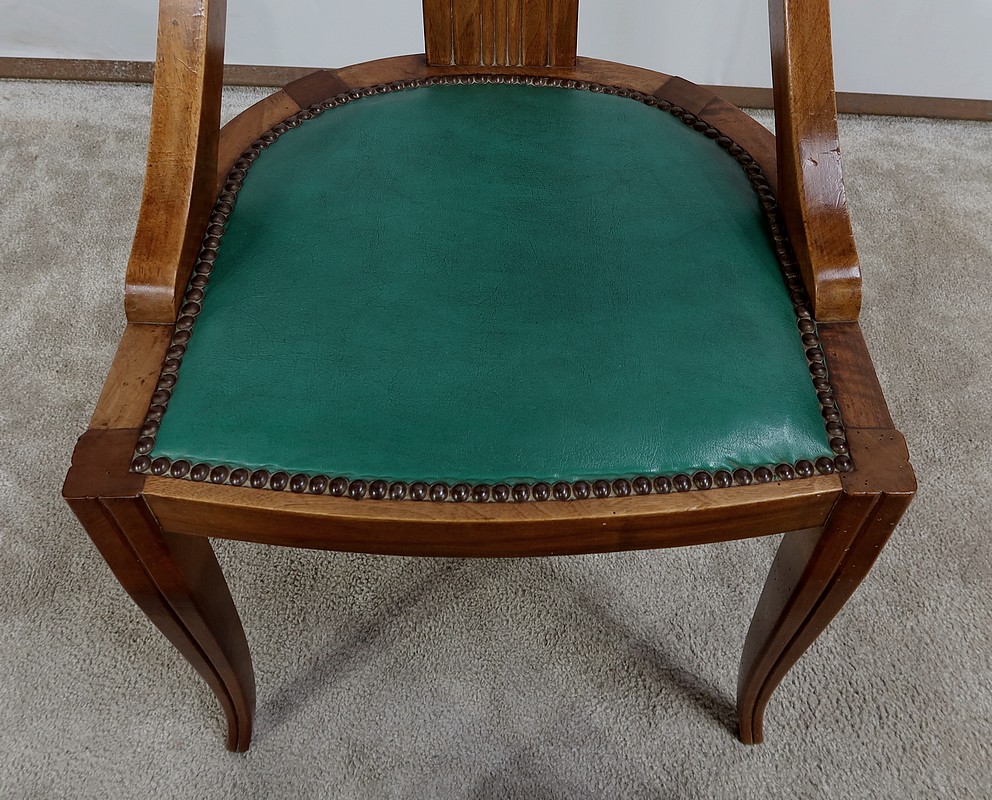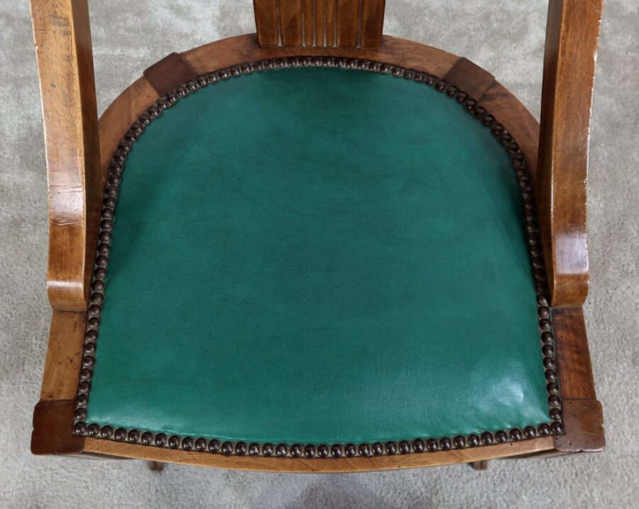 Ceux-ci sont assemblés à tenons et mortaises à la ceinture, large et arrondie vers l’arrière. L’assise est équerrée et à sangles traditionnelles. Celle-ci est garnie d’un simili cuir vert clouté en son pourtour.