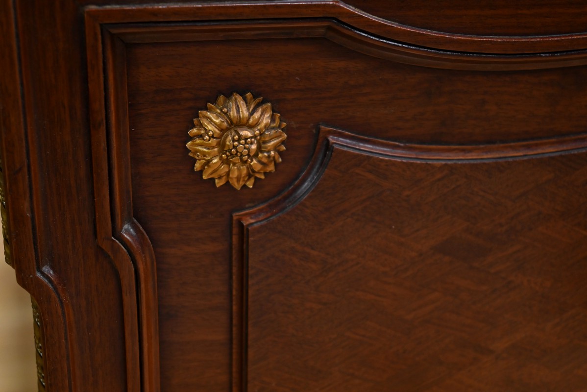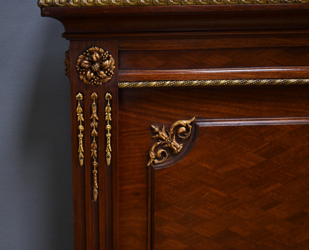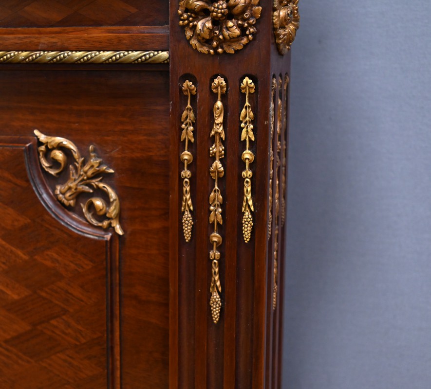 Un médaillon, délicatement ciselé, arbore des rameaux formant une couronne, assurant une parfaite continuité visuelle entre les différentes parties du meuble.
