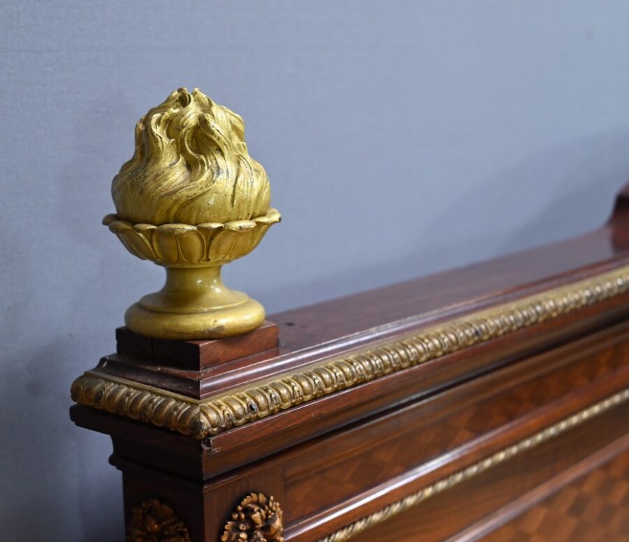 Son imposante tête de lit, marquetée de petits losanges, témoigne d’un savoir-faire artisanal remarquable.