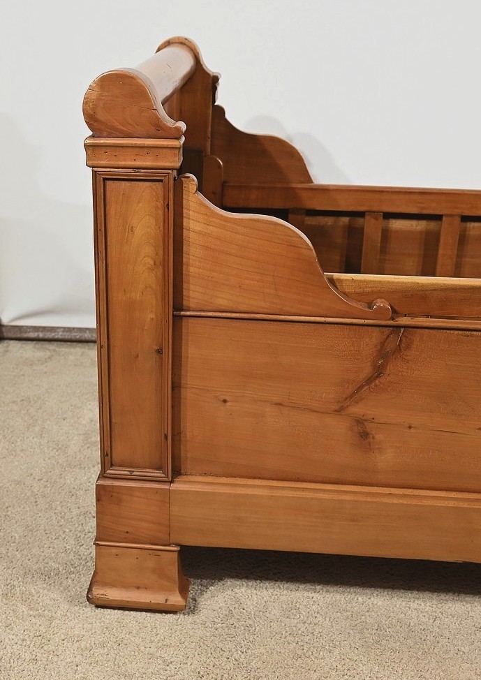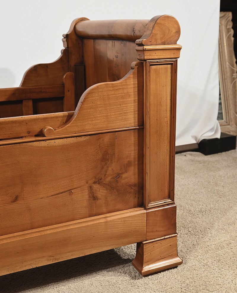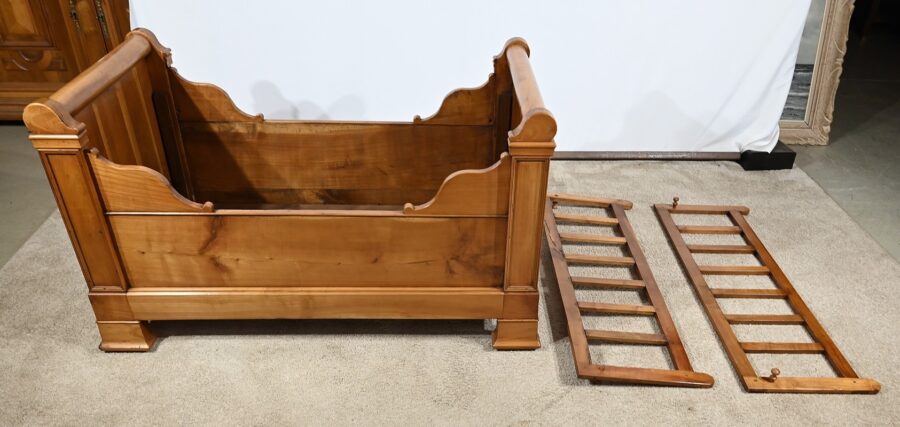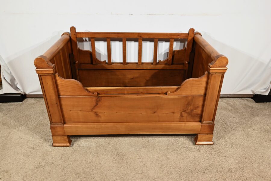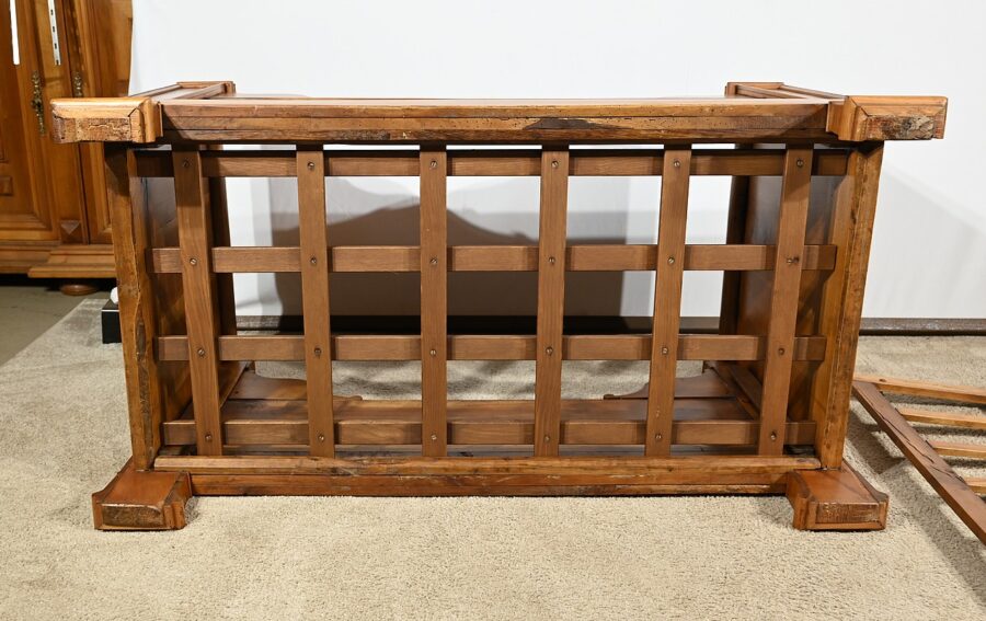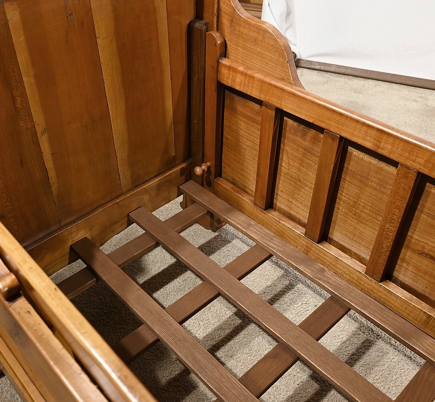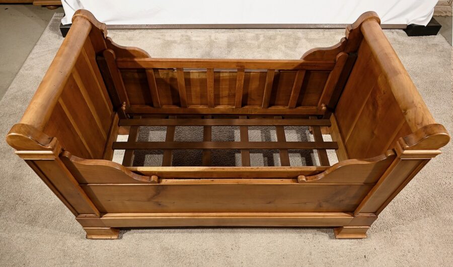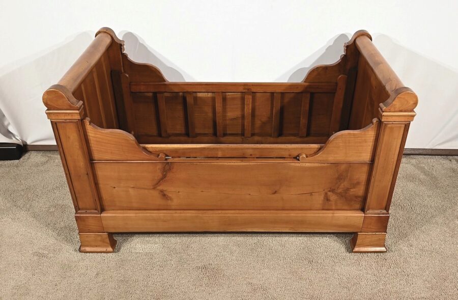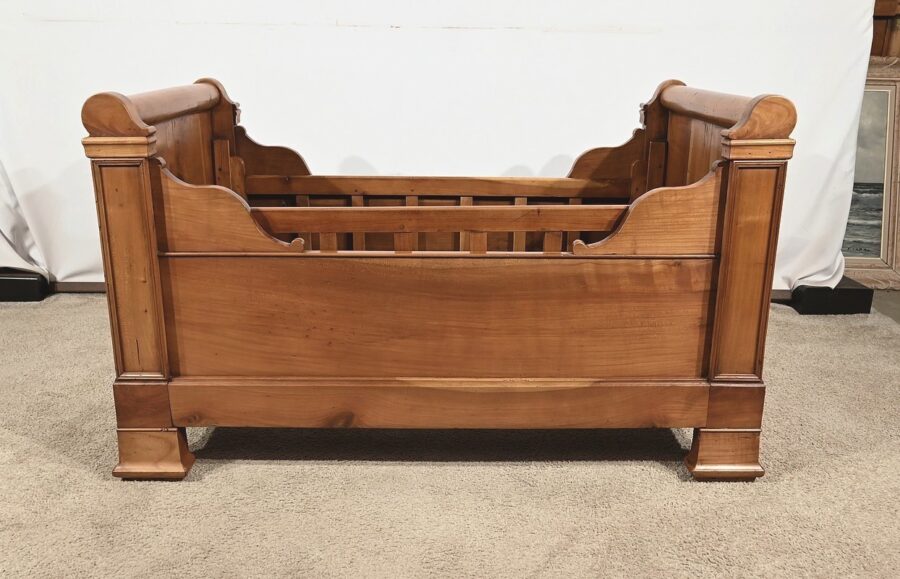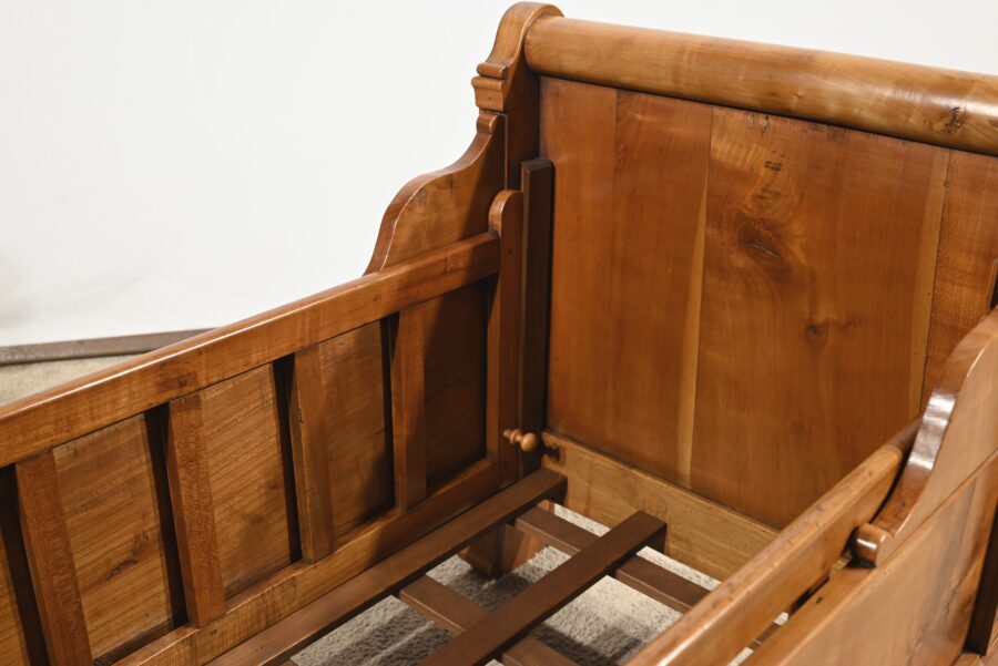 Ce lit de milieu en merisier massif est composé de deux bouts de lit de même hauteur avec un dessus à rouleau. Les façades sont dotées de moulures et reposent sur des pieds sabots. Ces deux façades d’une seule planche chacune, sont habillées d’un jonc et d’une console découpée rejoignant les pieds. Autour, la plinthe dotée d’une légère gorge.