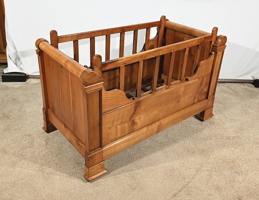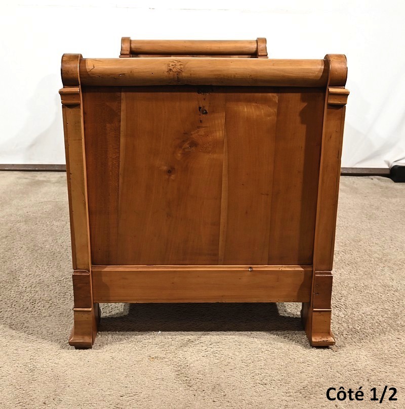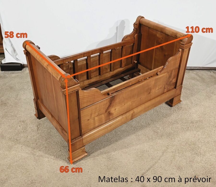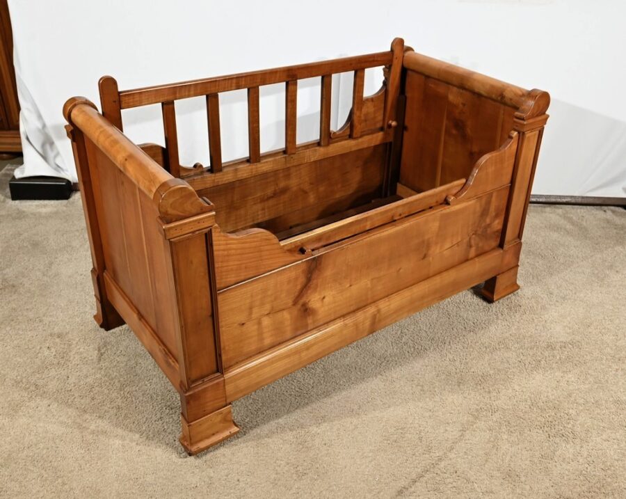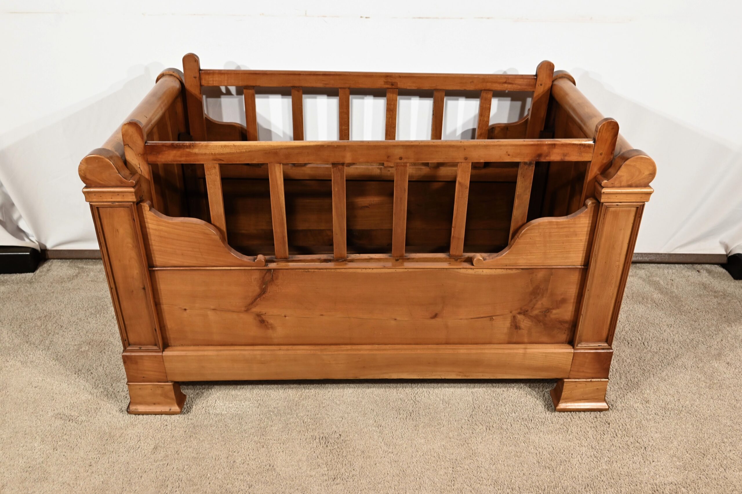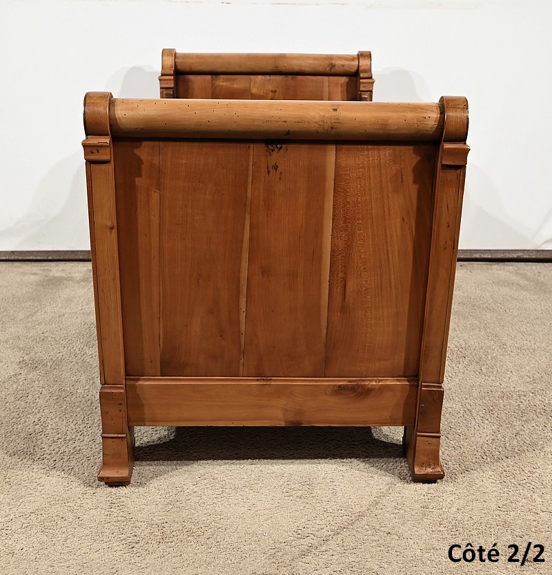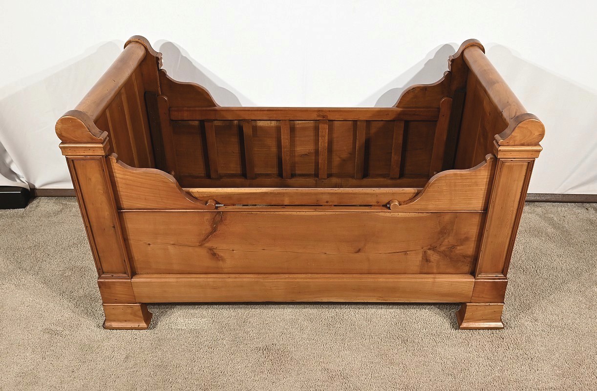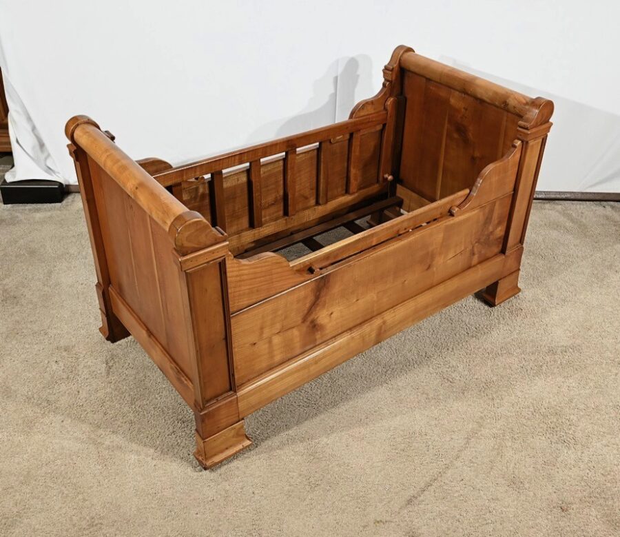 Ce lit de milieu en merisier massif est composé de deux bouts de lit de même hauteur avec un dessus à rouleau. Les façades sont dotées de moulures et reposent sur des pieds sabots. Ces deux façades d’une seule planche chacune, sont habillées d’un jonc et d’une console découpée rejoignant les pieds. Autour, la plinthe dotée d’une légère gorge.