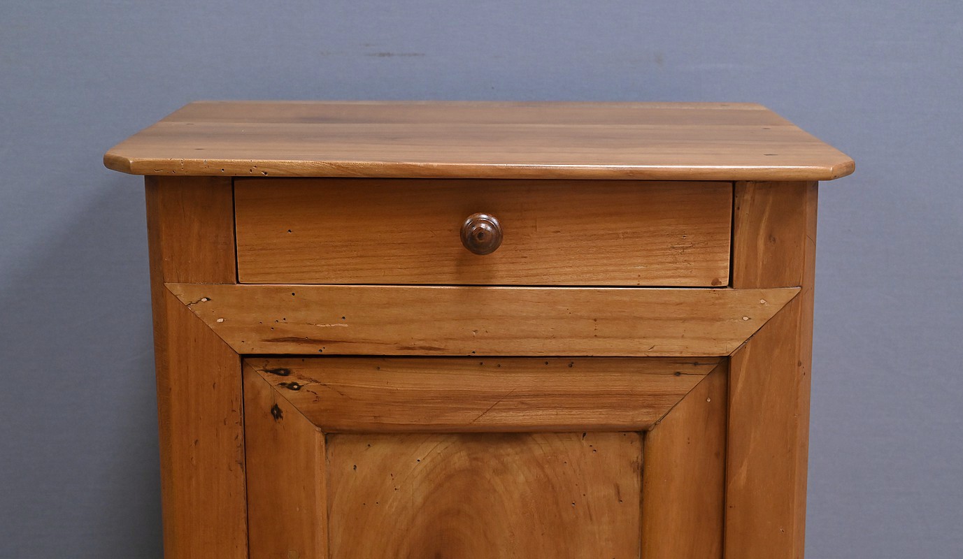 Ce chevet en merisier massif, datant du début du XXe siècle, séduit par son authenticité. Il s’ouvre par un tiroir en ceinture doté d’un bouton en bois tourné. Sous ce dernier, une porte garnie d’un panneau entouré d’un cadre à coupe d’onglet est munie d’un bouton de tirage en bois tourné assorti qui complète harmonieusement l’ensemble. Son intérieur intègre une étagère pour un rangement optimisé. Les montants à pans coupés discrets, renforcent son allure structurée, tandis que la plinthe moulurée apporte une finition épurée. L’ensemble repose sur des pieds dit console, lui conférant stabilité et élégance.