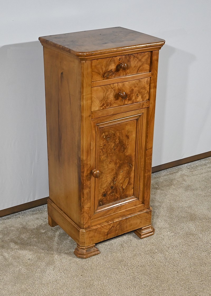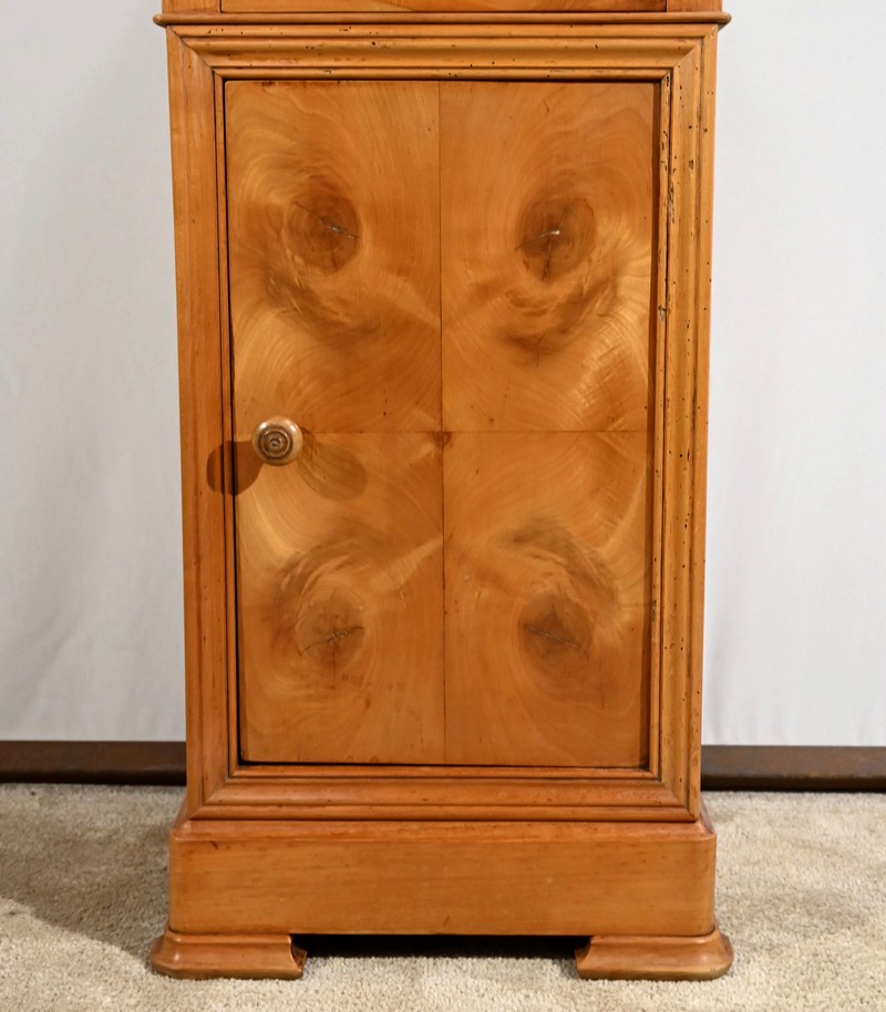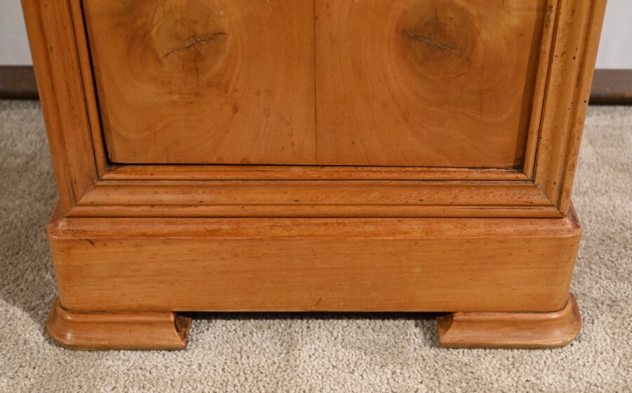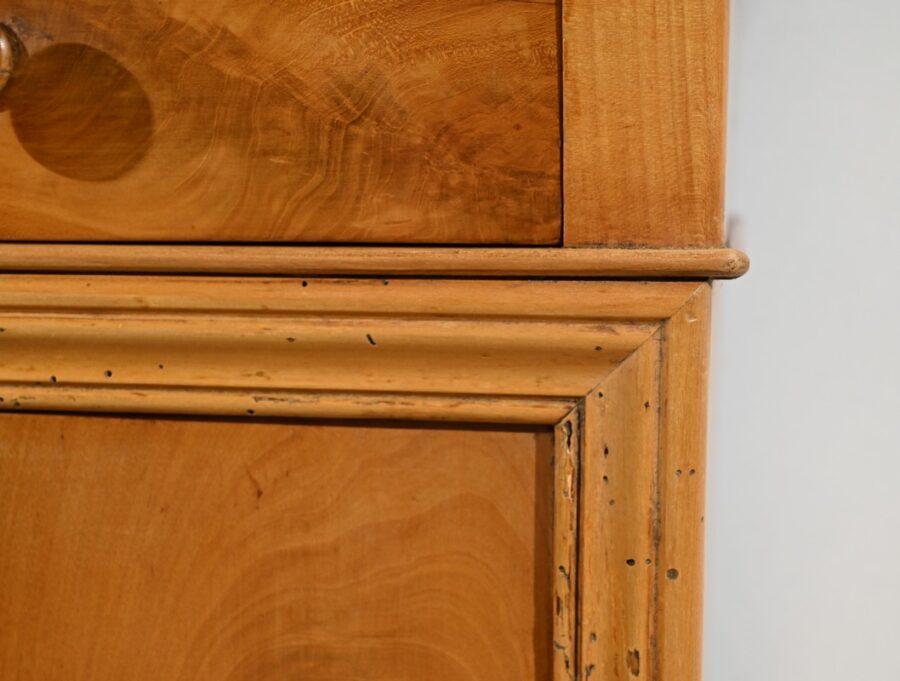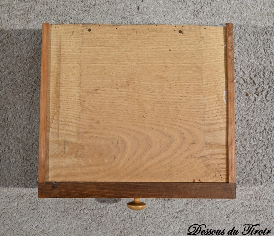 En dessous ce petit meuble présente également une porte, foncée d’un panneau en placage en ronce de merisier disposé en quatre-feuilles, à encadrement à coupe d’onglet mouluré et à bouton bois équipé d’un loquet fer.