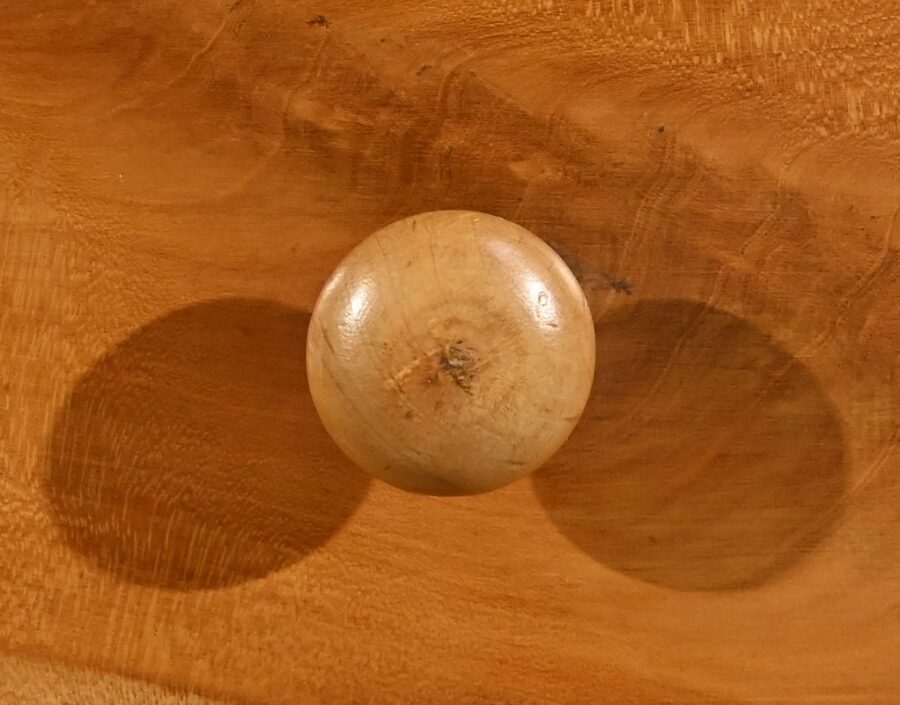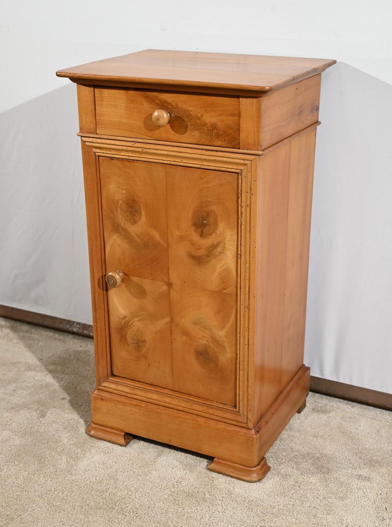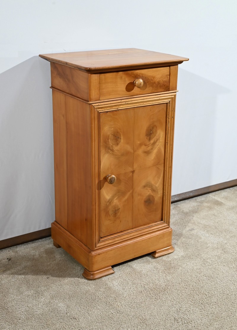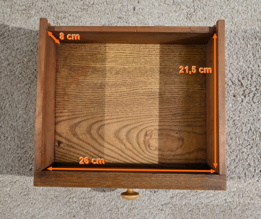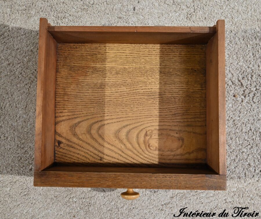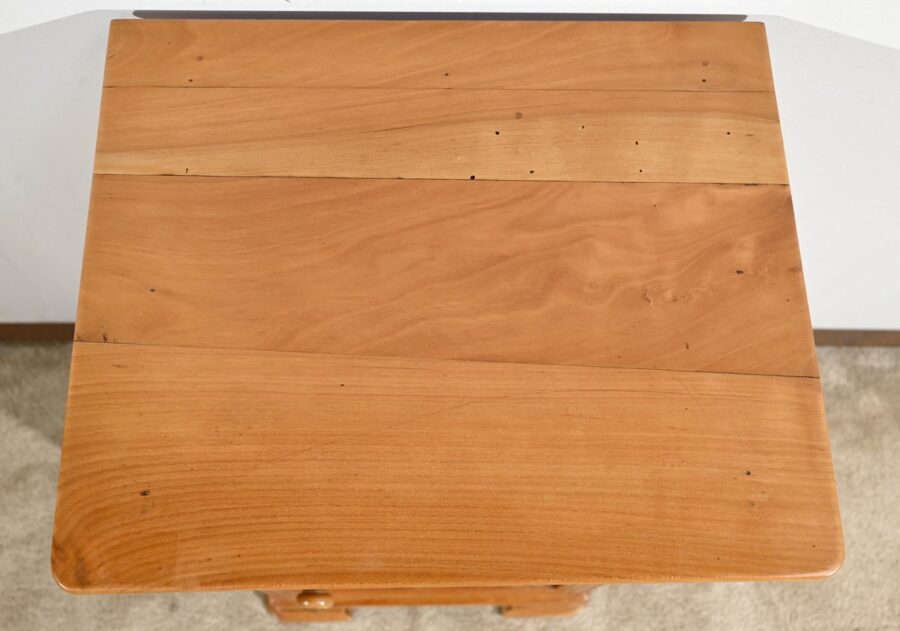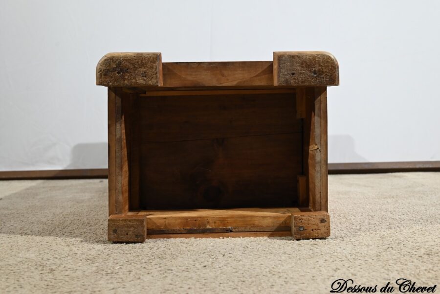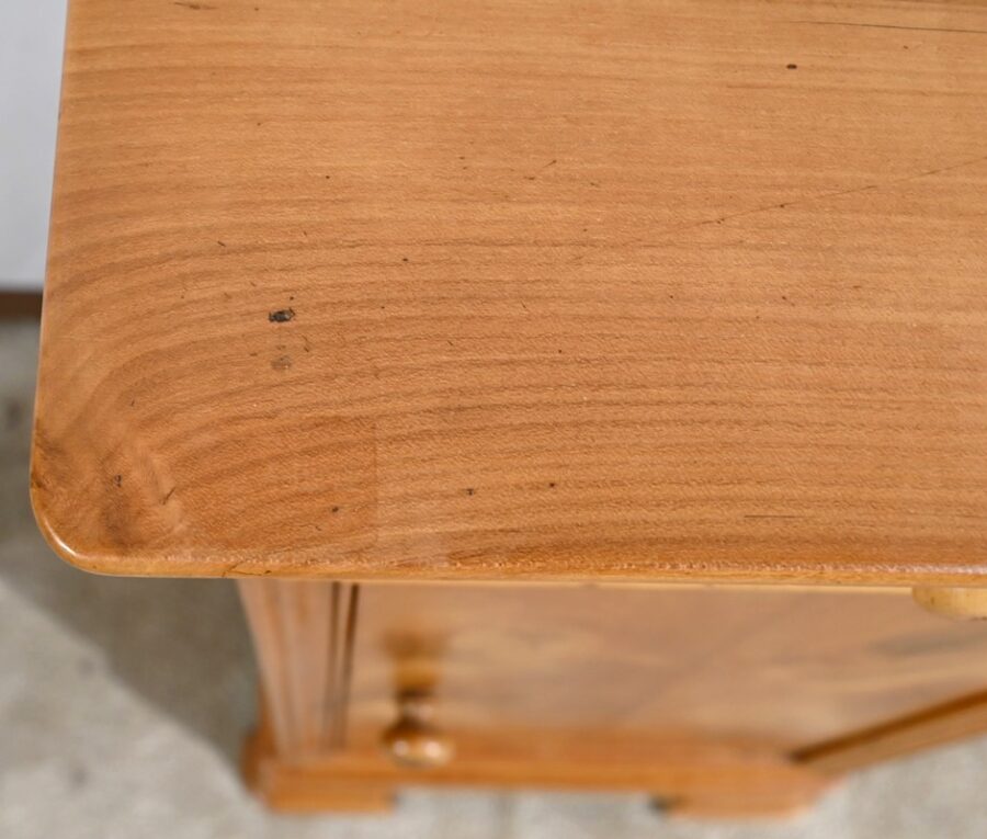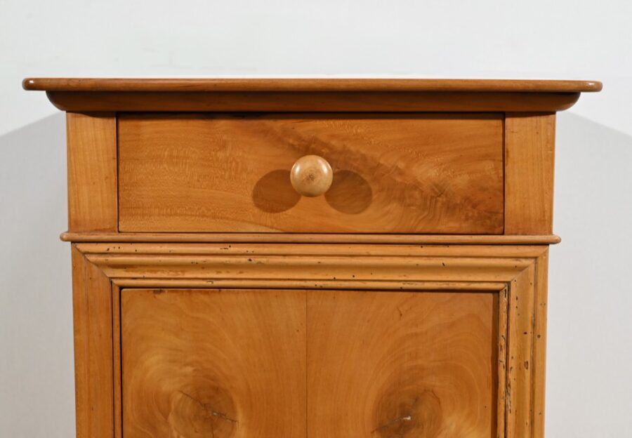 Ce petit chevet en merisier ouvre par un tiroir en ceinture muni d’un bouton bois tourné.