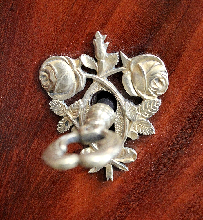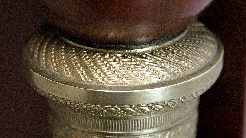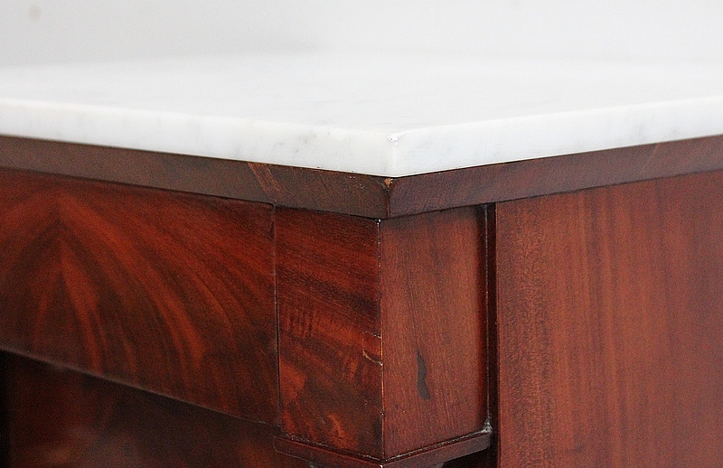 La Façade de ce Mobilier est flanquée de chaque côté, de deux Colonnes Cylindriques en Ronce d’Acajou. Sommées d’une belle Boule en Acajou massif, elles s’embellissent d’élément en Bronze finement ciselé, dont celui en partie haute est bagué d’une Collerette plus large. À l’avant, dans le prolongement des Colonnes, les montants reposent sur deux petits pieds Écrasés, presque Cylindriques tandis qu’à « l’arrière », ils sont droits.
