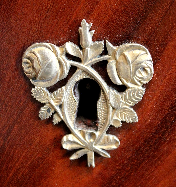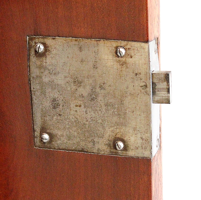 Ce Petit meuble possède deux ouvrants en Ronce d’Acajou. En ceinture, un Tiroir, doté d’une encoche en dessous pour faciliter son ouverture. Plus bas, une petite Porte donnant accès à un intérieur garni d’une Tablette fixe, du même Marbre. Ce battant est équipé d’une Serrure en état de Fonctionnement accompagnée de sa Clé, le tout est d’Origine.