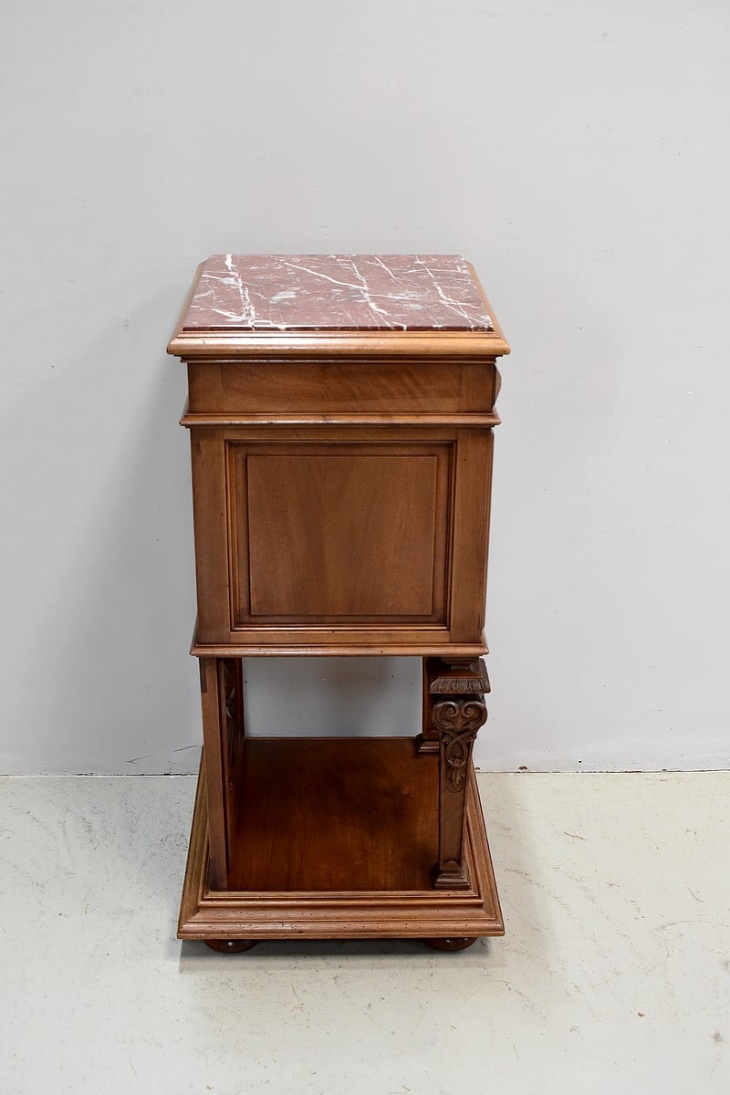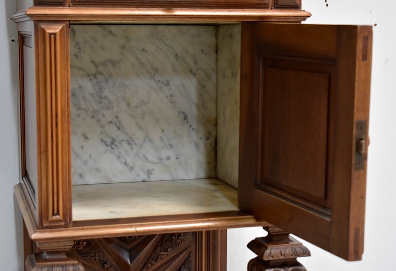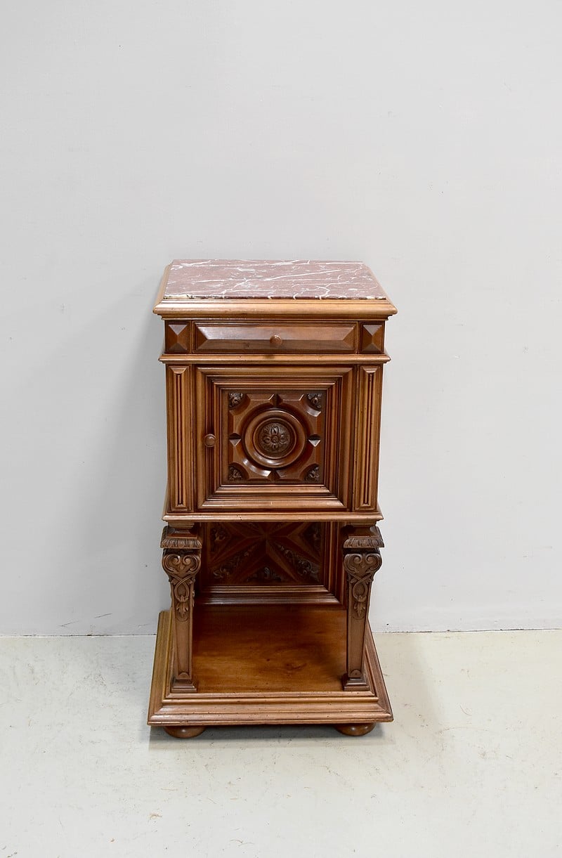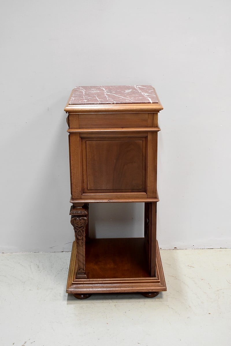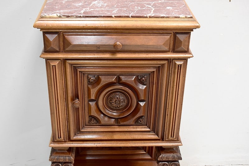 Chevet haut sculpté dans le goût Renaissance en Noyer massif avec son dessus en marbre Rose vif des Pyrénées encastré.