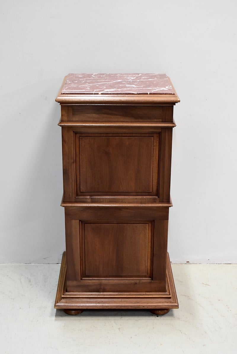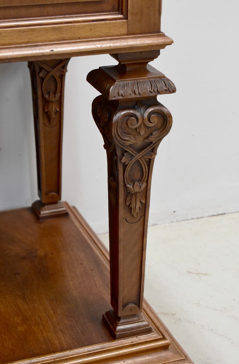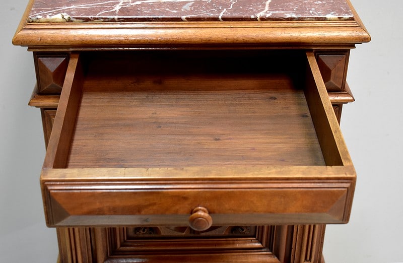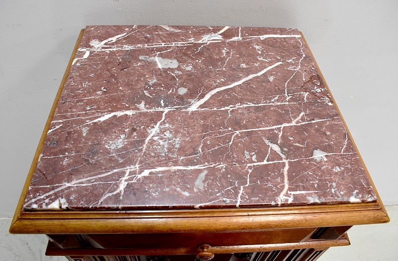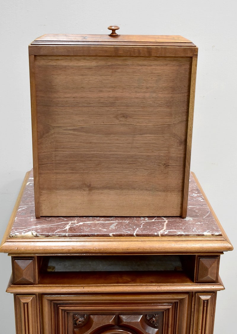Chevet haut sculpté dans le goût Renaissance en Noyer massif avec son dessus en marbre Rose vif des Pyrénées encastré.