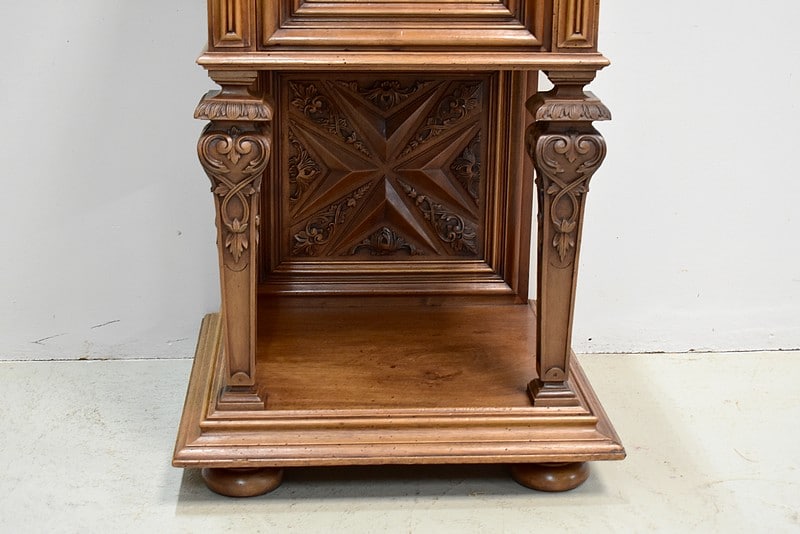 En dessous, il dispose d’un espace fermé sur un fond sculpté d’une étoile et porté par 2 pilastres de forme rectangulaire sculptés, moulurés et gainés, reposant sur une tablette à multiple moulures.