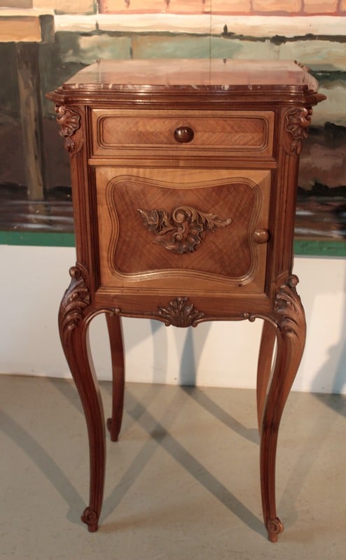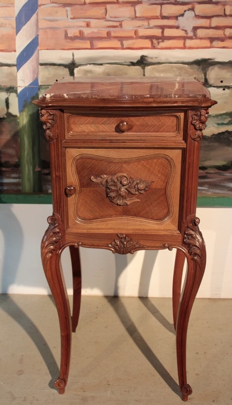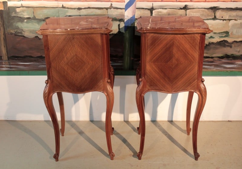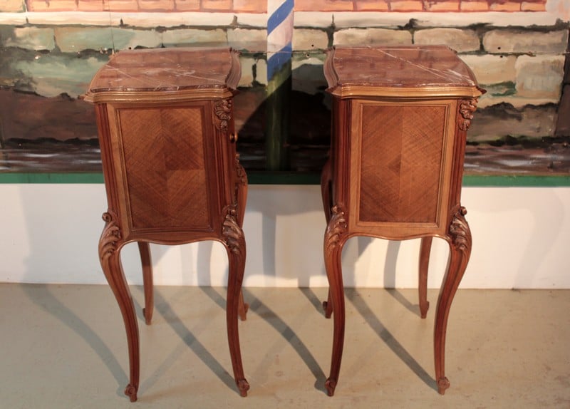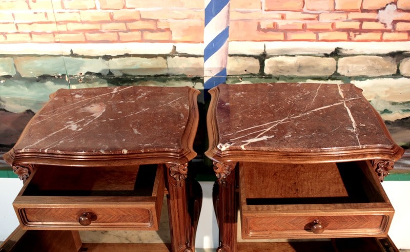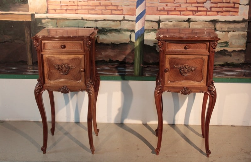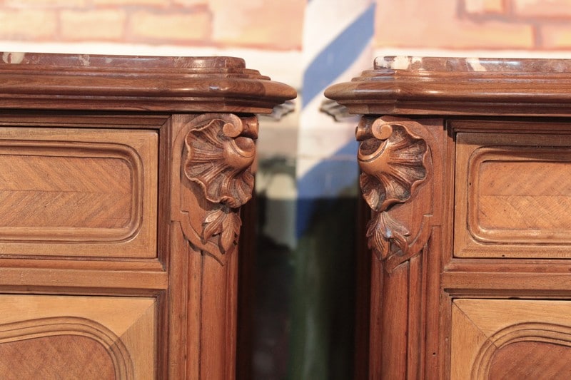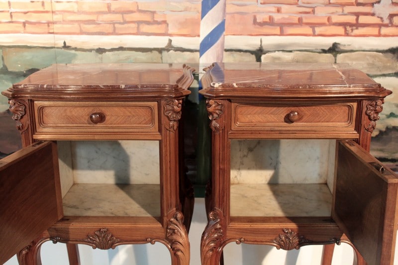 Paire de chevets de style Louis XV – Rocaille en noyer avec dessus de marbre bordeaux veiné de gris. Ils ouvrent par un tiroir et une porte et reposent sur 4 pieds galbés. L’intérieur est en marbre blanc veiné. Décors de coquilles et de feuilles. Époque 1920.